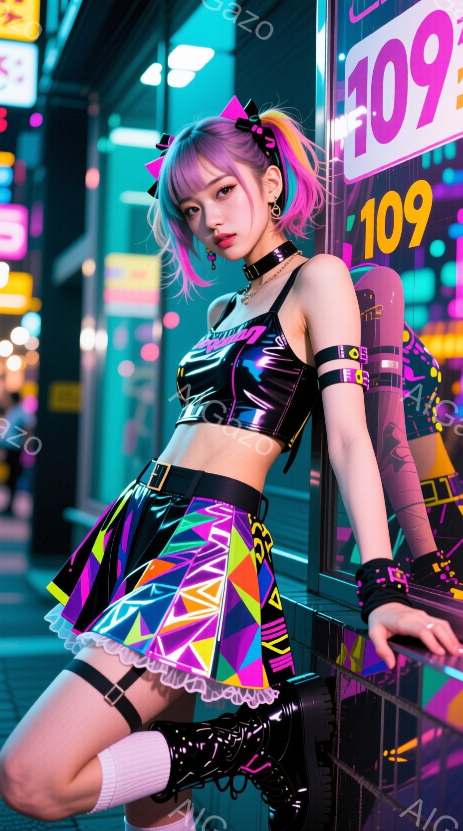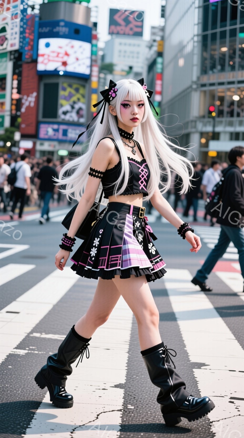 鮮やかな色のミニスカートと、それに合わせたタンクトップを着た若い女性が、渋谷のスクランブル交差点で歩いています。彼女は、ピンクのリボンで飾られたポニーテールと、明るい色のネイルが特徴で、自信に満ちた表情で足元をしっかりと踏みしめています。背景には高層ビルが立ち並び、多くの人が行き交う賑やかな街の様子がうかがえます。
