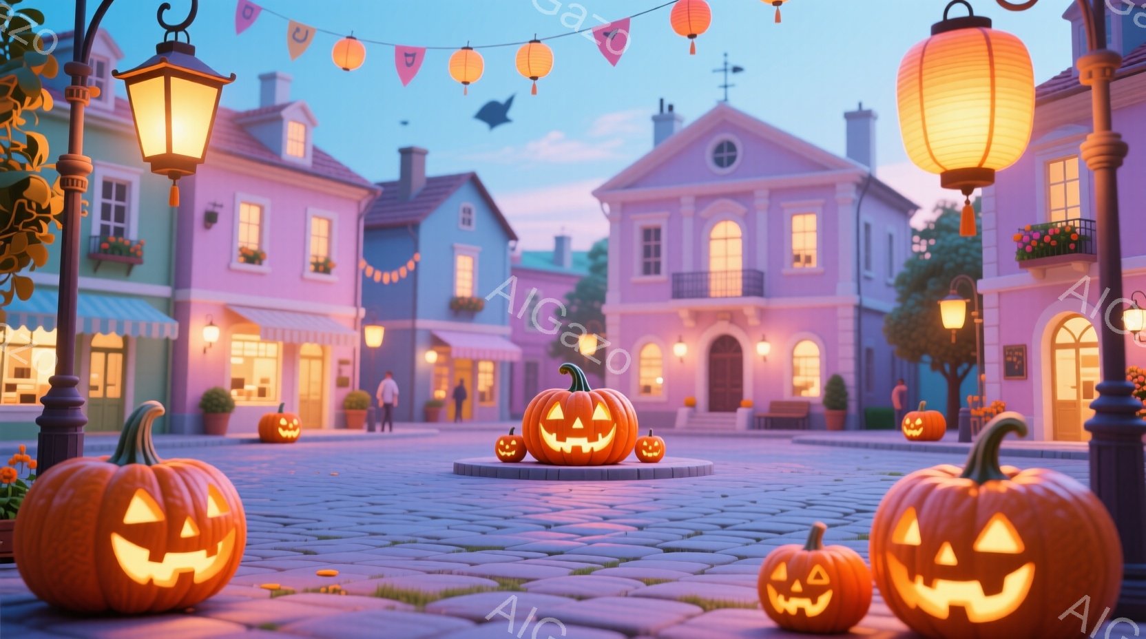 舗装された石畳の通りに、ジャック・オー・ランタンがいくつか並べられています。背景には、パステルカラーの可愛らしい建物が並び、オレンジ色の提灯が通りを照らしています。全体的に暖かく、お祭りやハロウィンのような楽しい雰囲気が漂っています。