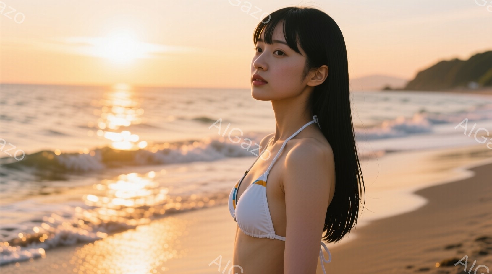 赤褐色のビキニを着た女性が、夕焼けを背景に正面を向いて立っている。彼女はゆるやかなウェーブのかかった髪を持ち、やや物憂げな表情をしている。背景は鮮やかなオレンジと赤の夕焼けで、空全体がドラマチックな色彩に染まっている。