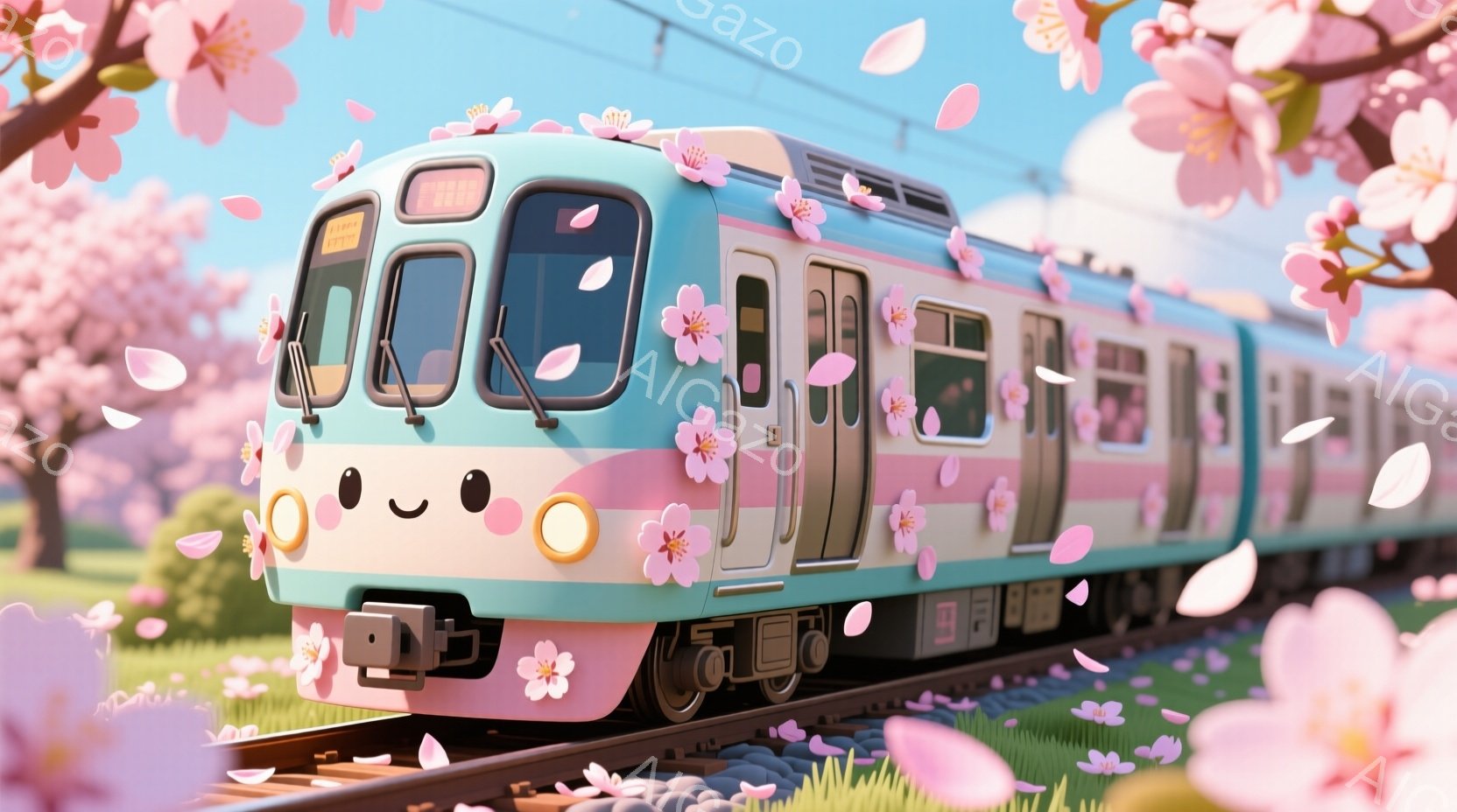 ピンク色の電車が線路の上を走っており、可愛らしい顔と大きな目を持っています。電車の周りには桜の花びらが舞い散り、春の暖かく穏やかな雰囲気を醸し出しています。背景には緑の草と青い空が見え、心地よい季節を感じさせます。