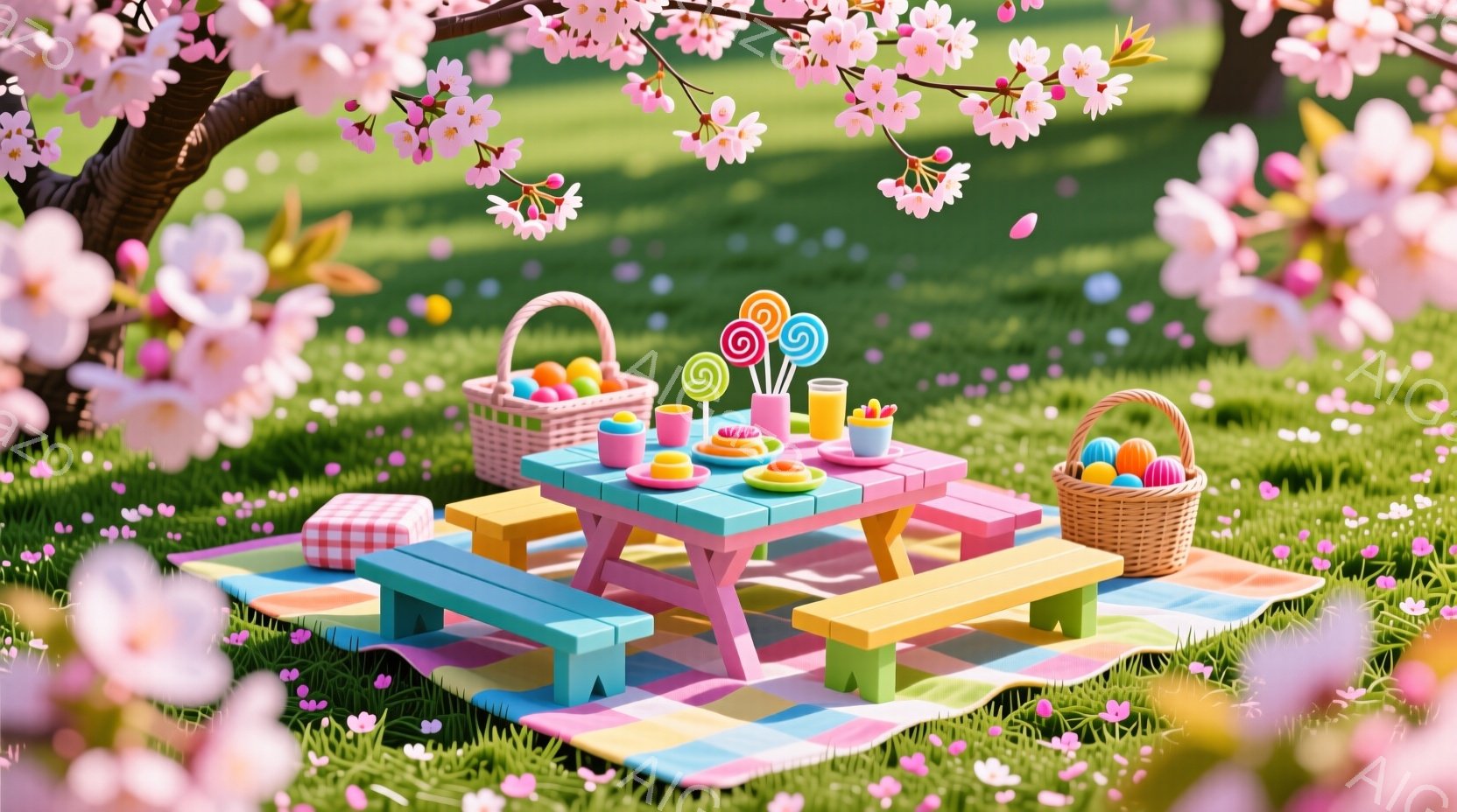 ピンク色の可愛らしい電車が、桜の花びらが舞う緑色の草原を走っています。電車の正面には、大きな目と口が描かれており、まるで生きているかのような表情をしています。背景には、桜の木が咲き誇り、春の穏やかで華やかな雰囲気が漂っています。