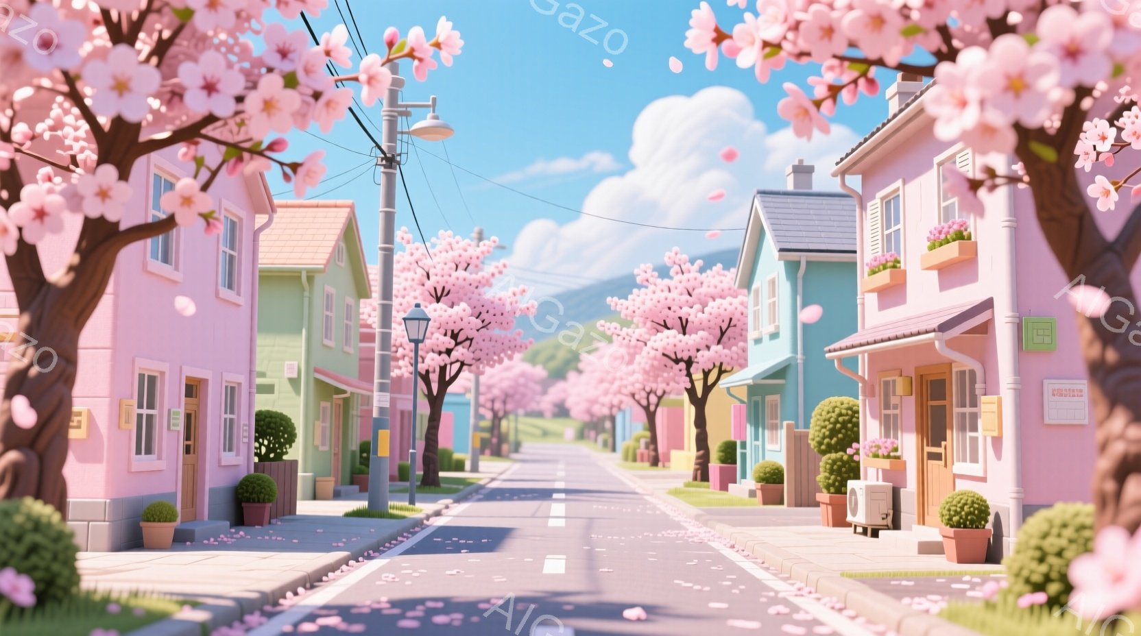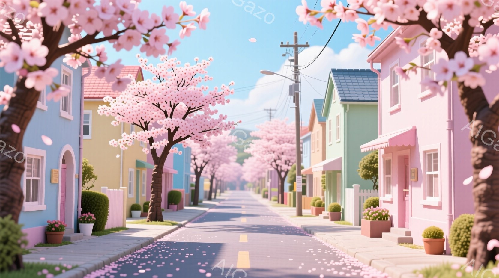 桜並木が続く、色彩豊かな住宅街の風景です。淡いピンク、緑、紫色の家々が整然と並び、アスファルトの道には散り始めた桜の花びらが舞っています。穏やかな日差しが降り注ぎ、春の暖かさと静けさを感じさせる、可愛らしい雰囲気です。