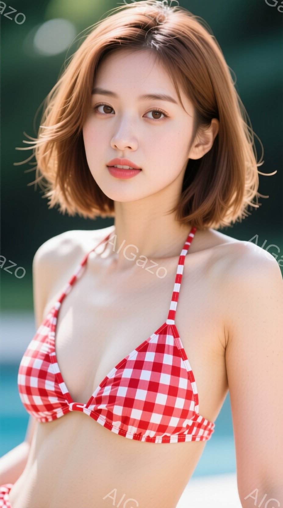「赤と白のチェック柄のビキニを着た若い女性が写っています。彼女は肩までの長さの茶髪で、わずかに微笑んでいます。背景には緑豊かな植物と水色の水面が見え、明るい日差し」は、2025年11月26日に作成されたAI生成画像です。 チェック柄をテーマとした高品質なビジュアル素材で、 928×1664px の解像度で提供しています。 個人利用・商用利用ともに無料でダウンロード可能で、クレジット表記も不要です。