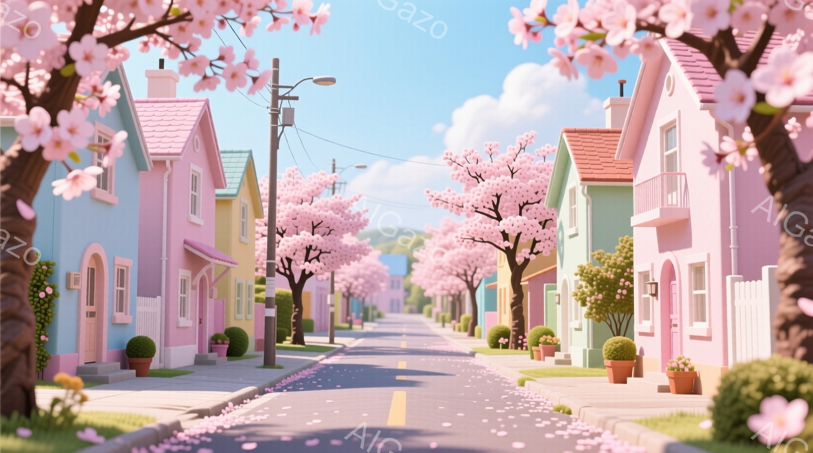 春の穏やかな住宅街の風景です。ピンク色の桜並木が道沿いに続き、カラフルで可愛らしい家々が整然と並んでいます。空は晴れ、ふわふわとした雲が浮かび、散りゆく桜の花びらが、暖かく優しい雰囲気を醸し出しています。