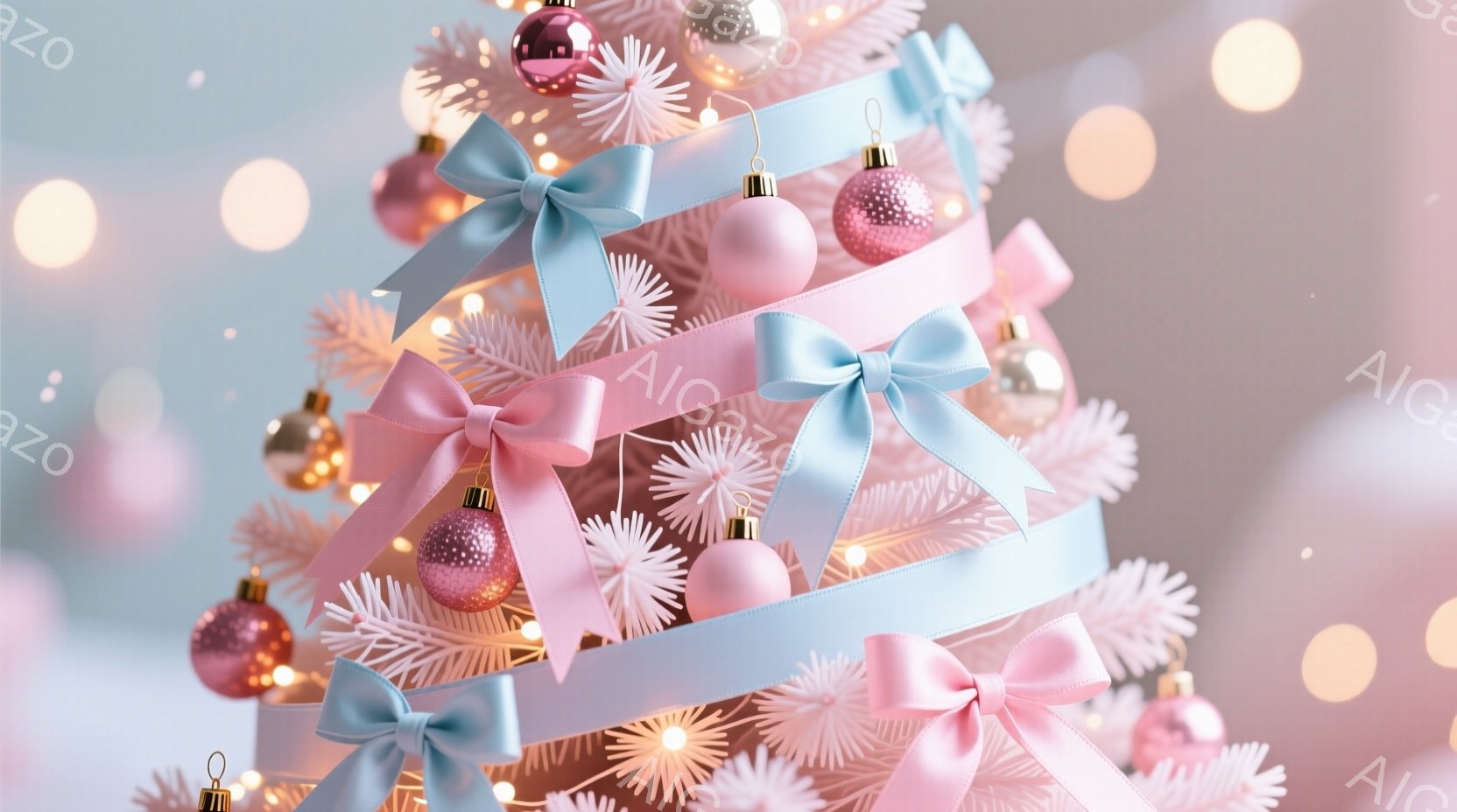 淡いピンク色のクリスマスツリーが、明るい背景を背景に映えています。ツリーはリボンやオーナメントで飾られ、温かい光が灯っています。背景には、暖炉とプレゼントボックスが見え、クリスマスの穏やかで華やかな雰囲気が漂っています。