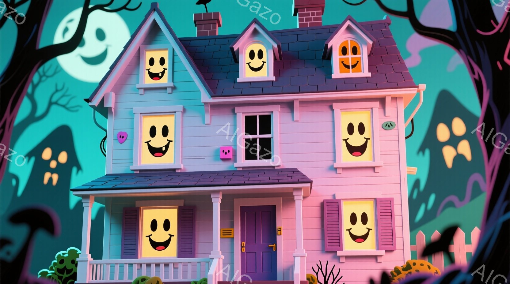 ハロウィーンをテーマにした可愛らしい家が描かれています。家はピンク、緑、紫の色で塗られ、窓や玄関に笑った顔が描かれており、ハロウィーンの雰囲気を醸し出しています。背景には満月が輝き、シルエットの幽霊や黒い木々が描かれ、お祝いムードを盛り上げています。