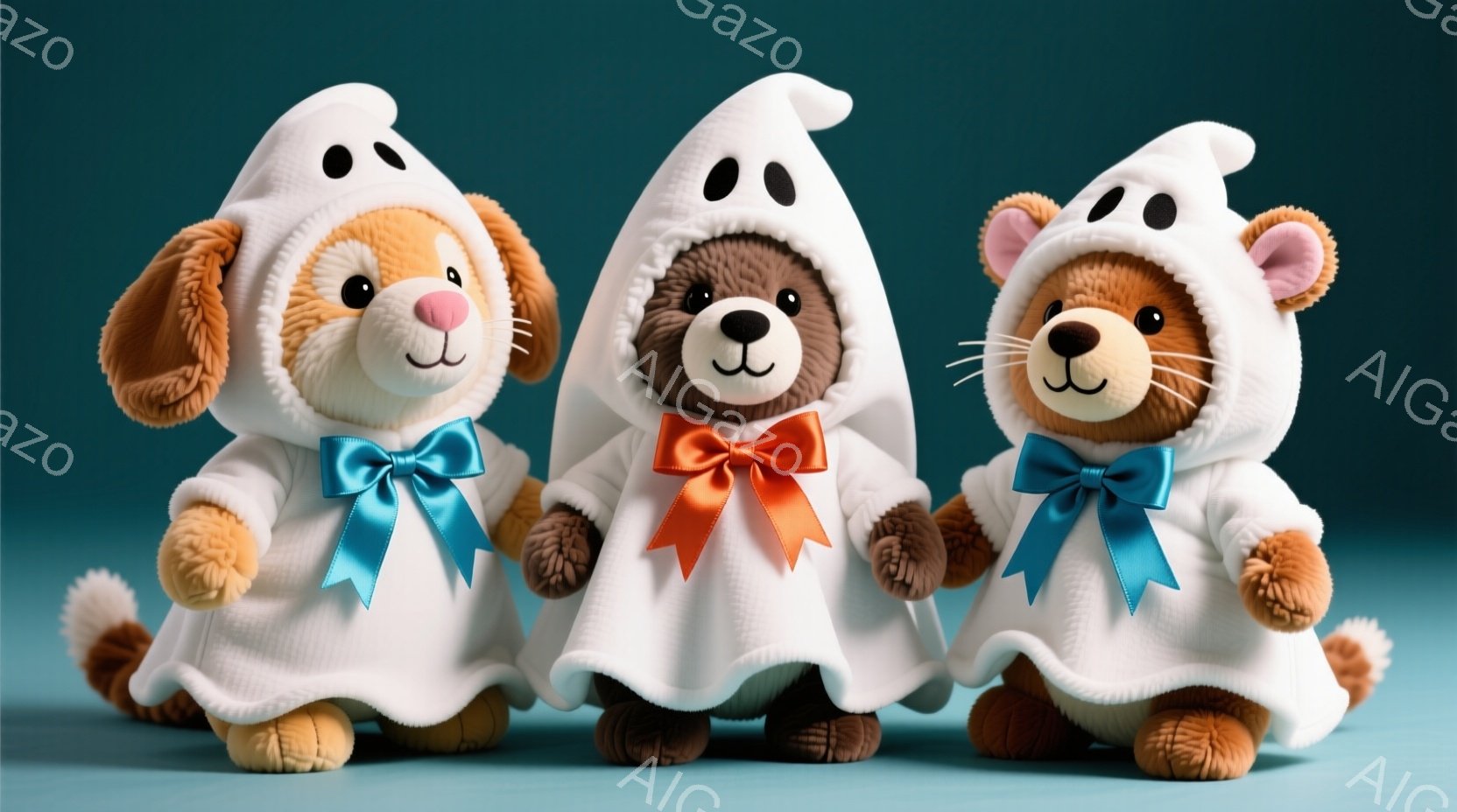 この無料AI生成画像「三匹のテディベアがそれぞれお化けの衣装を着ています。一番左は茶色いクマで、お化け衣装の内側が見えるように頭に被せています。背景は水色で、ハロウィーンを連想させる飾りやカボチャが配置され、全体的に可愛らしく、お祝いの雰囲気が漂っています。」は、2025年10月22日に作成されました。 サイズは 1664×928px の高解像度で、商用利用も可能なフリー素材として提供しています。