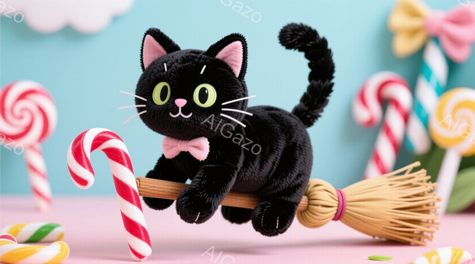 黒い猫がほうきにまたがり、空を飛んでいるように見えます。ピンク色のリボンが首に巻かれ、幸せそうな表情をしています。背景にはカラフルなキャンディや雲が浮かび、お祭りや夢のような楽しい雰囲気を醸し出しています。