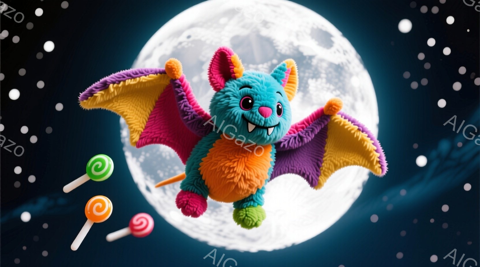明るい満月を背景に、カラフルなストライプ模様の毛むくじゃらのコウモリが空を飛んでいます。コウモリはピンク、オレンジ、黄色、緑、青、紫の色で構成され、赤い瞳と微笑んだ表情で、まるでキャンディのようなカラフルな粒が尾を引いています。夜空には星が散りばめられ、全体的に夢のような、遊び心のある雰囲気を醸し出しています。