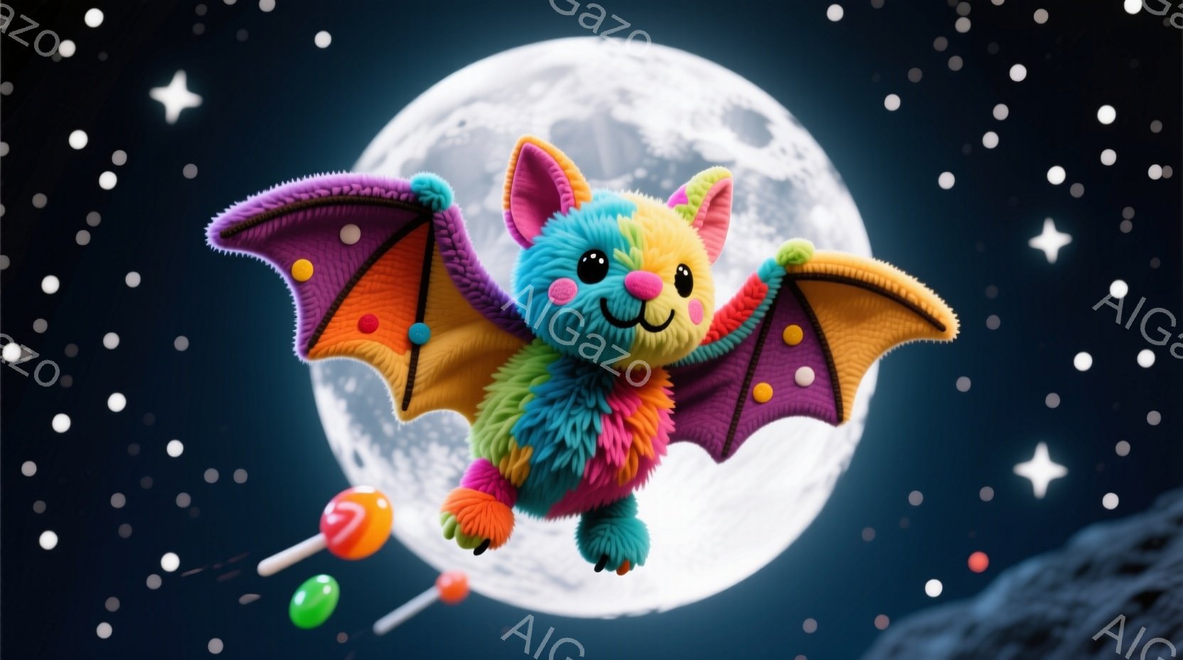 明るい夜空を飛ぶ、カラフルな毛並みのコウモリが描かれています。コウモリは虹色のボディと水色の足を持ち、嬉しそうな表情をしています。背景には大きく明るい満月と、様々な色の星が散りばめられています。