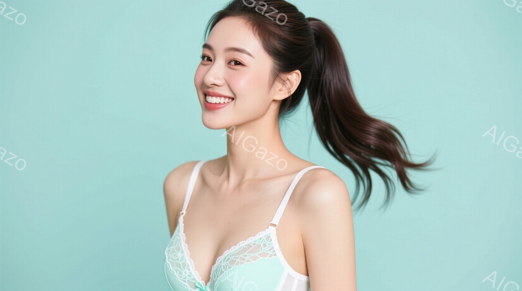 「明るい水色の背景を背景に、茶色の長い髪をポニーテールにした若い女性が写っています。白いレースがあしらわれた水色のブラジャーを着て、微笑んでいます。彼女の姿勢はリ」は、2025年11月26日に作成されたAI生成画像です。 ターコイズをテーマとした高品質なビジュアル素材で、 1664×928px の解像度で提供しています。 個人利用・商用利用ともに無料でダウンロード可能で、クレジット表記も不要です。