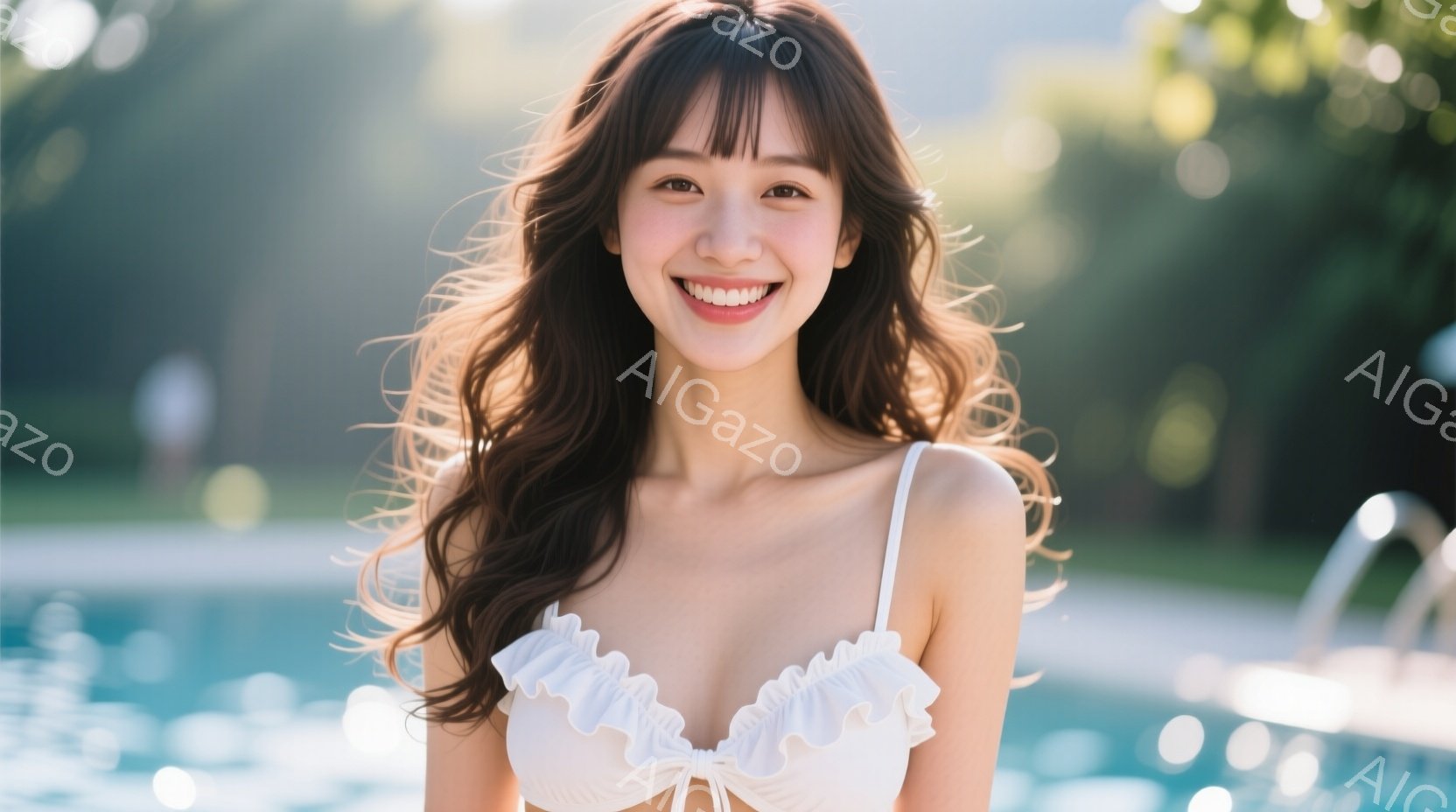 彼女は白いフリル付きの水着を着て、明るい笑顔を見せています。長い茶色の髪は肩にかかり、自然なウェーブがかかっています。背景には青いプールと緑豊かな植物が見え、晴れた日のリラックスした雰囲気を醸し出しています。