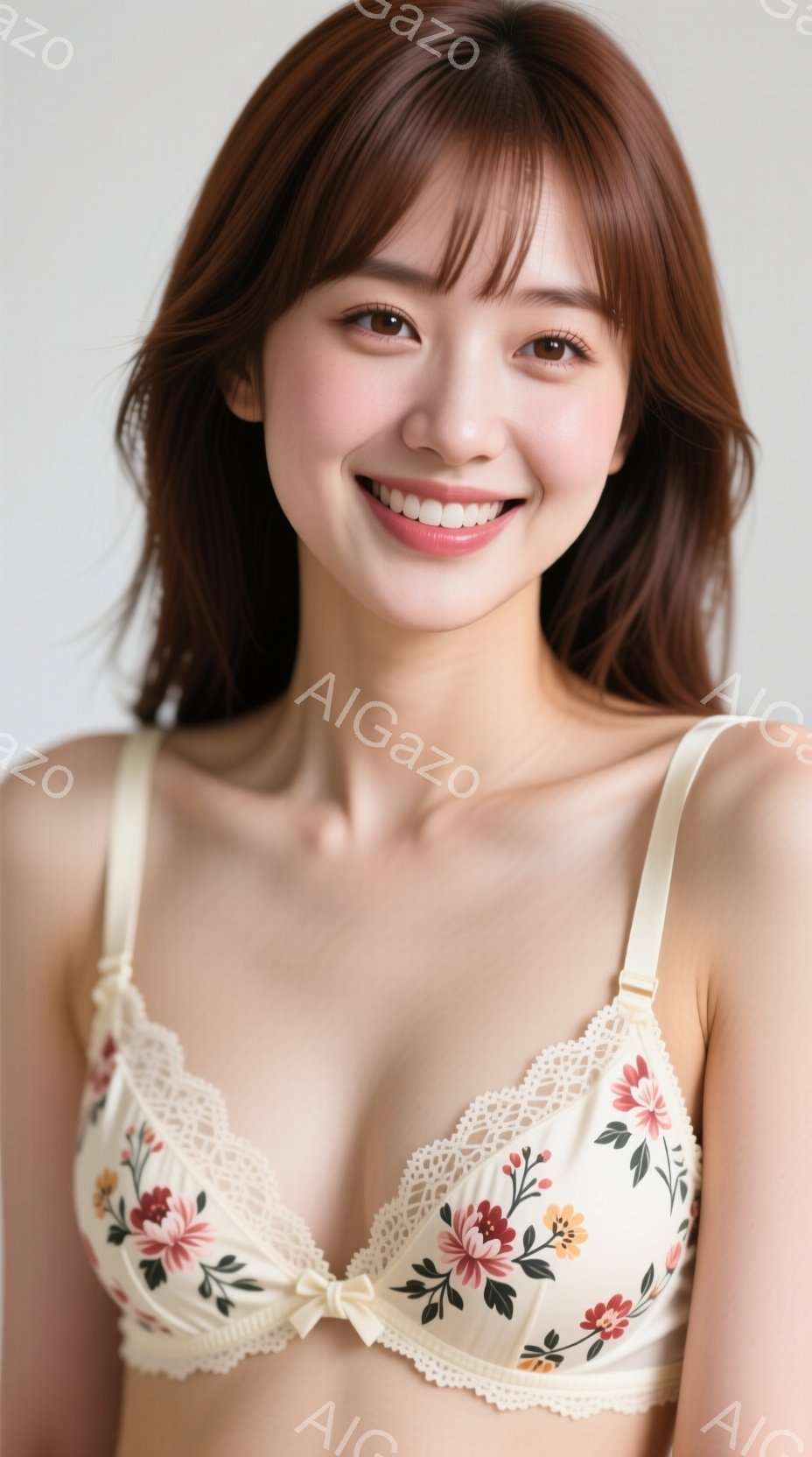 明るい色の花柄ブラレットを身につけた若い女性が写っています。彼女は肩までの長さの茶髪で、少し微笑んでいます。背景は白くシンプルで、女性が強調されています。