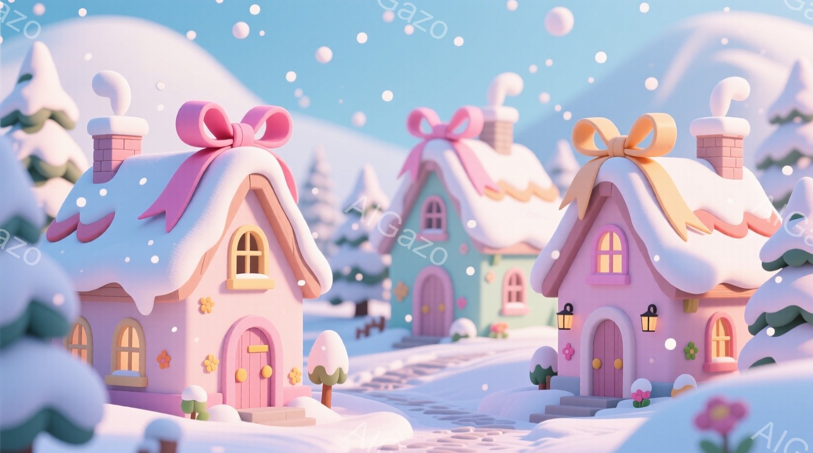 雪が降る可愛らしい村の風景です。パステルカラーの家々が並び、それぞれ屋根には雪が積もり、一部には大きなリボンが飾られています。背景には雪化粧した木々と、穏やかな冬の空が広がり、暖かく幻想的な雰囲気を醸し出しています。