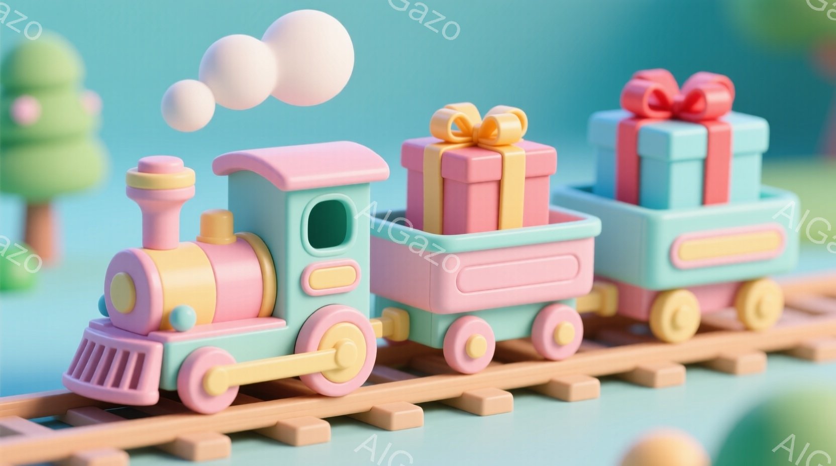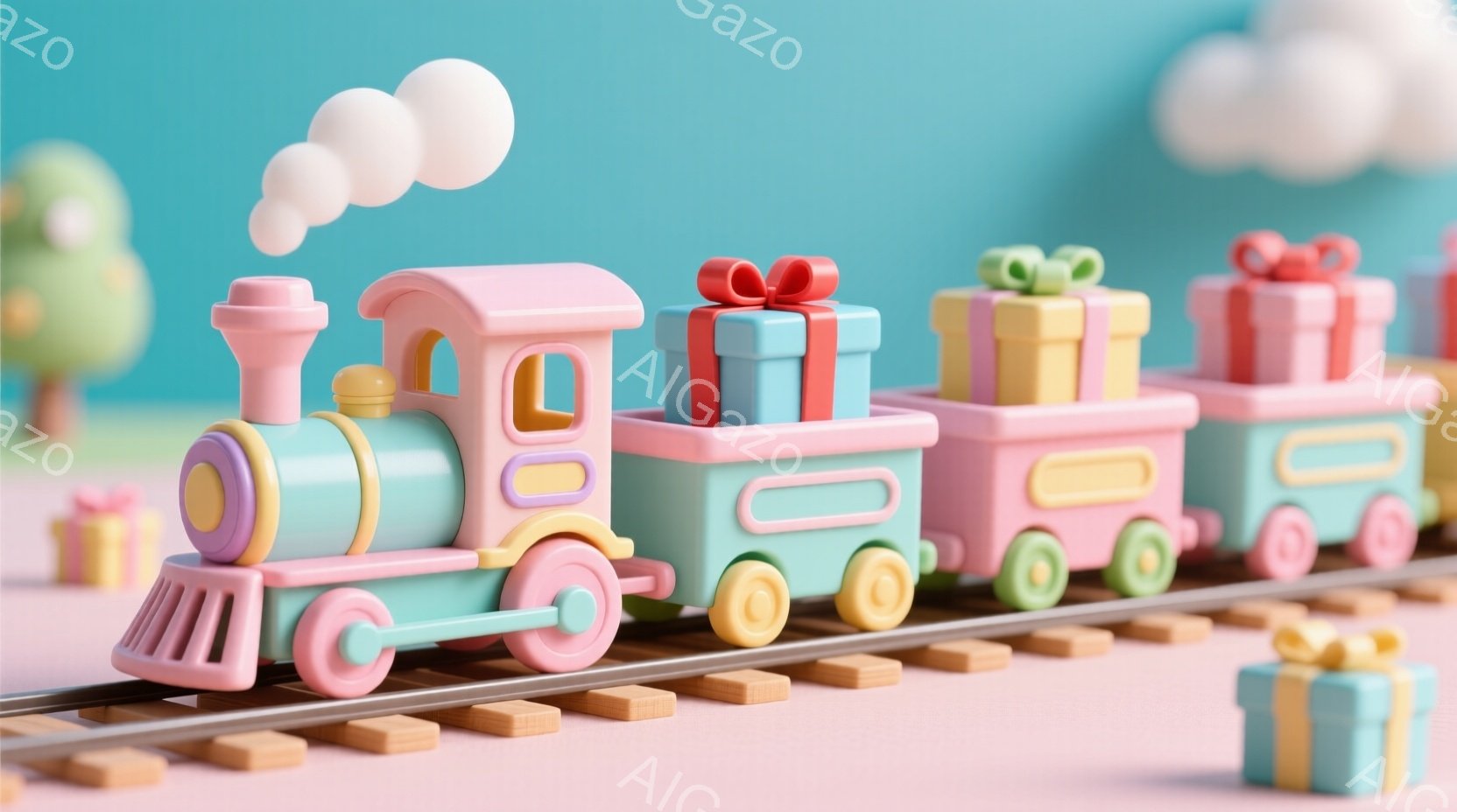 明るいピンクと水色の列車が、プレゼントの箱を積んで線路を走っている様子が描かれています。列車は丸みを帯びた可愛らしいデザインで、煙突からは白い煙が立ち上っています。背景は暗い色合いで、列車が際立っており、全体的に明るく楽しい雰囲気です。