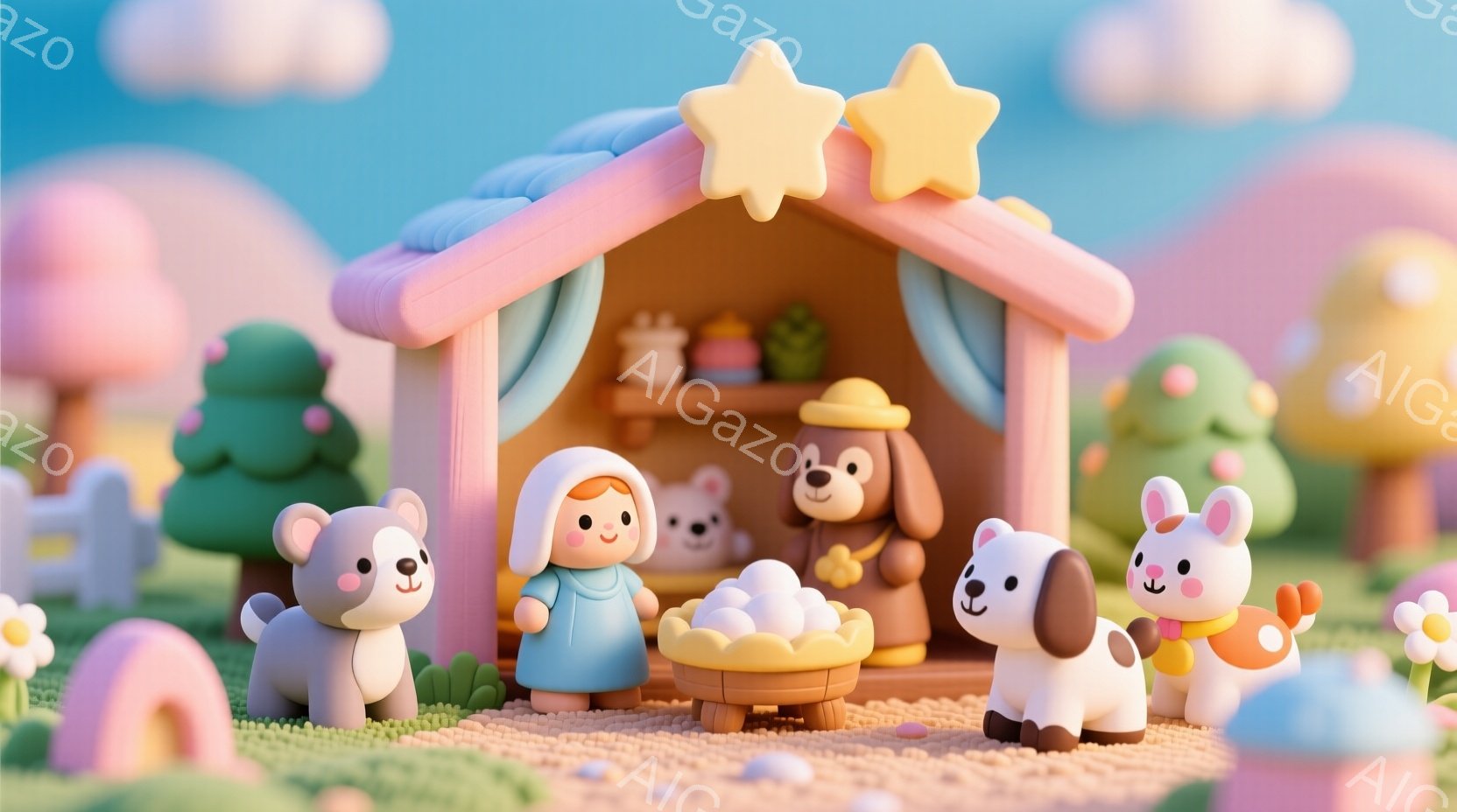 可愛らしい動物たちが集まったクリスマスのシーンを描いています。動物たちはそれぞれカラフルな服を着ており、笑顔で集まっています。背景にはパステルカラーの建物や木々が配置され、暖かく穏やかなクリスマスの雰囲気を醸し出しています。