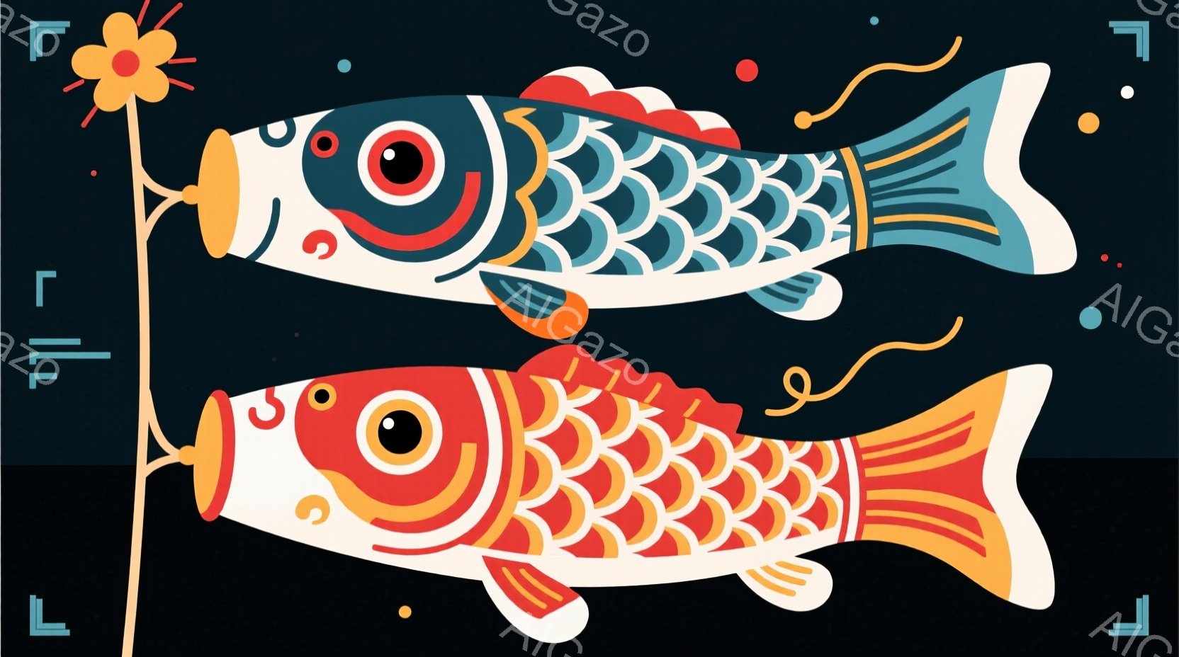 深い青色の背景に、鯉のぼりが三匹並んで描かれています。それぞれの鯉のぼりは異なる色合いで、オレンジ、青、そして再びオレンジ色です。背景には、提灯や風船のような装飾が散りばめられており、お祭りや子供の日を祝う陽気な雰囲気を醸し出しています。