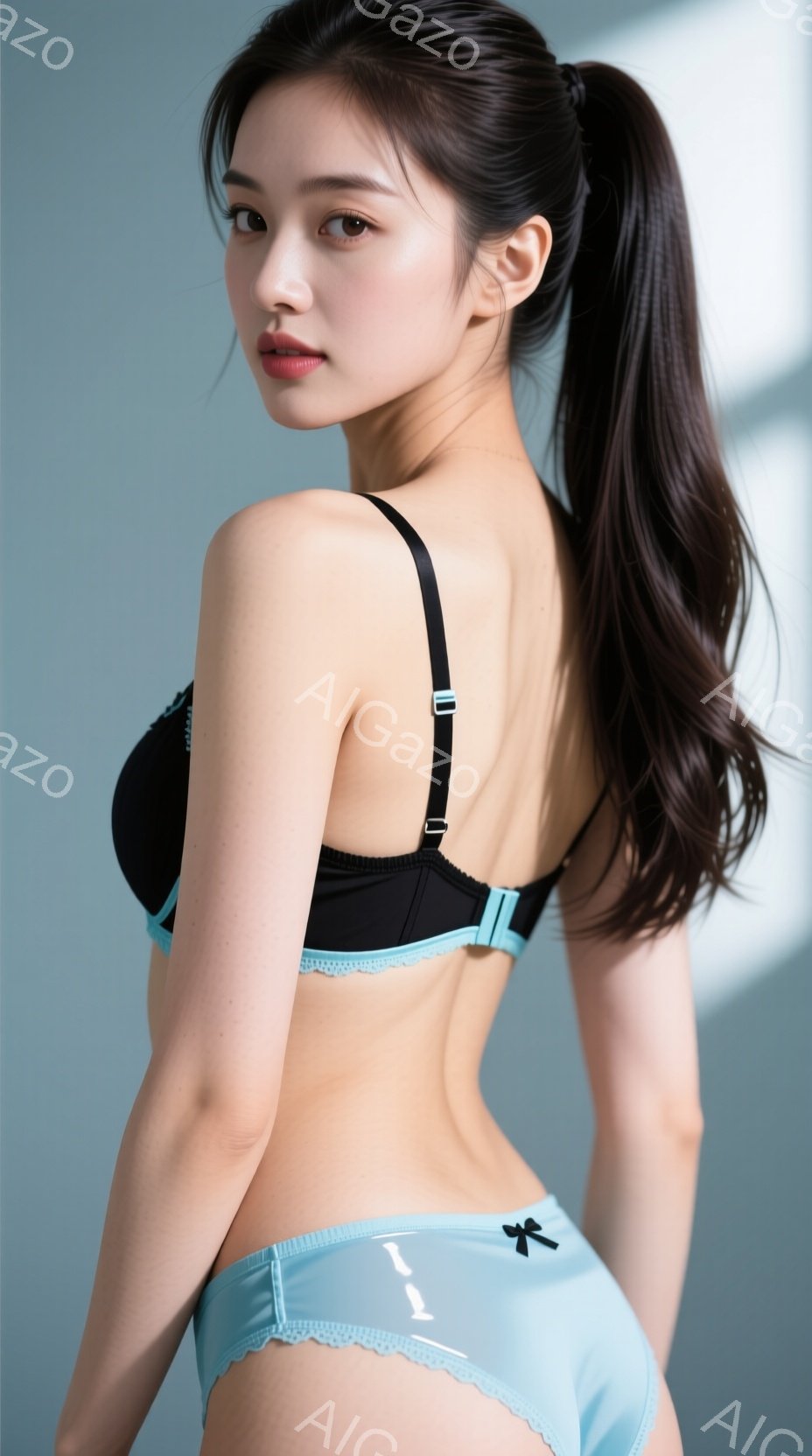 「長い茶色のウェーブヘアの女性が、黒のレースブラと水色のローライズパンティーを身に着けて立っています。彼女はわずかに微笑んでおり、姿勢はリラックスしていますが、自」は、2025年11月26日に作成されたAI生成画像です。 ウェーブヘアをテーマとした高品質なビジュアル素材で、 928×1664px の解像度で提供しています。 個人利用・商用利用ともに無料でダウンロード可能で、クレジット表記も不要です。