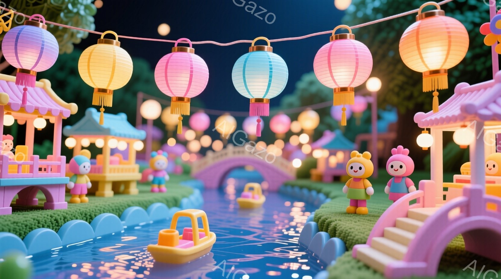 ふわふわの茶色のクマと黒い犬が、お祭り提灯のような乗り物に乗って空を飛んでいます。クマは赤いリボンで首を飾り、犬は金色のリボンをつけています。背景にはキャンディやカラフルな風船が浮かび、晴れた青空が広がっており、お祭りのような楽しい雰囲気が漂っています。