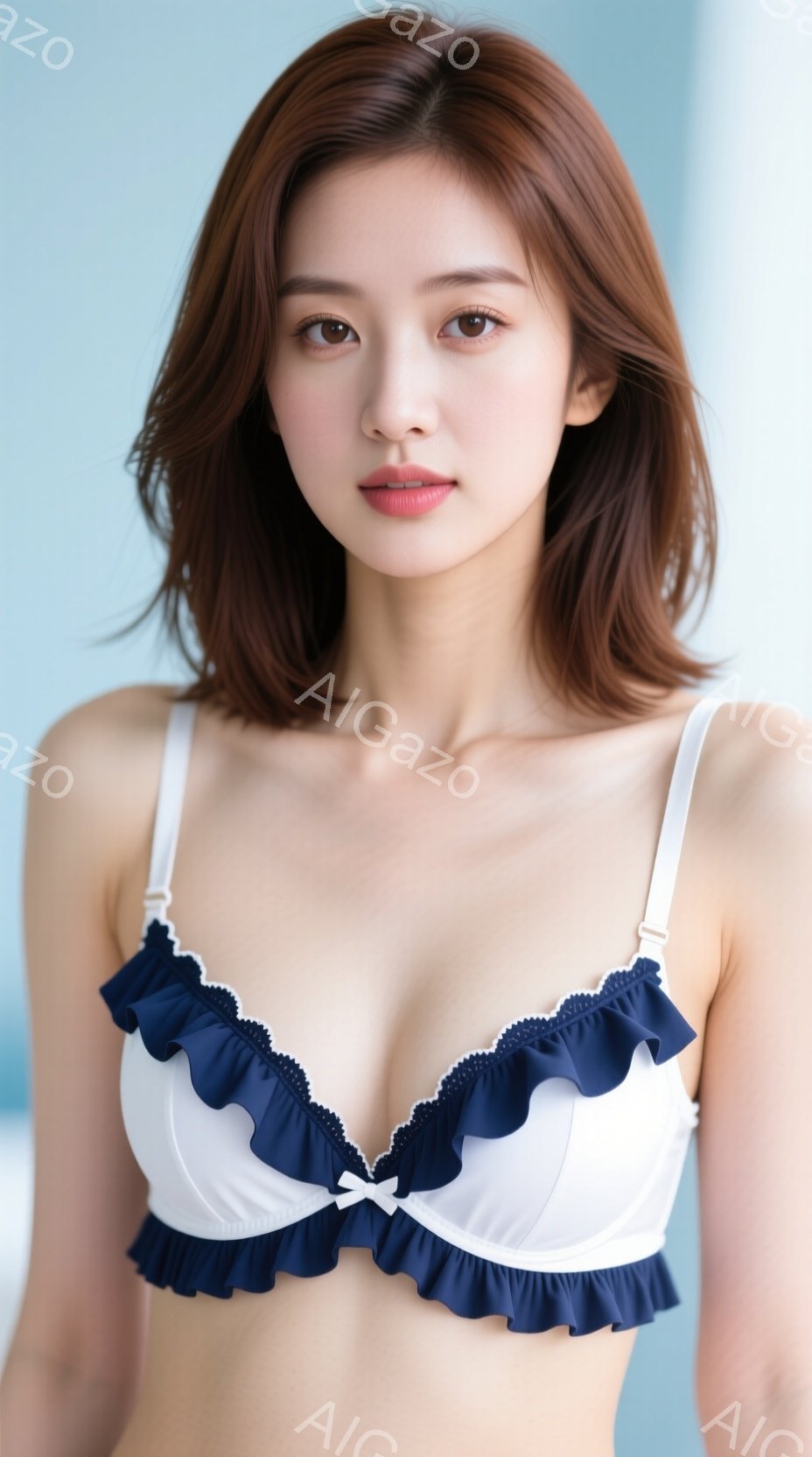 「明るい髪色の女性が、白いブラジャーにネイビーのフリルが施されたデザインを身に着けています。彼女は穏やかな表情で正面を見つめ、自然な笑顔を浮かべています。背景はぼ」は、2025年11月26日に作成されたAI生成画像です。 ナチュラルをテーマとした高品質なビジュアル素材で、 928×1664px の解像度で提供しています。 個人利用・商用利用ともに無料でダウンロード可能で、クレジット表記も不要です。