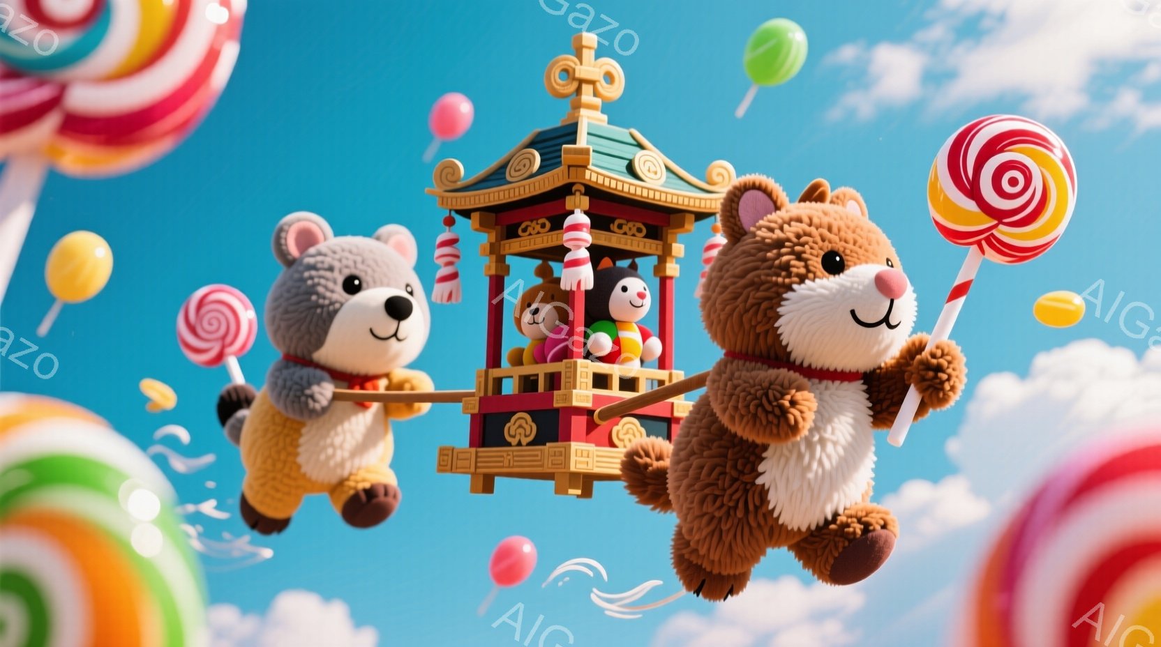 ふわふわした茶色のクマと灰色のネコが、それぞれキャンディを持った状態で空を飛んでいる様子が描かれています。彼らの頭には赤いリボンが結ばれており、表情は明るく楽しそうに見えます。背景は鮮やかな青空で、色とりどりのキャンディや、小さな寺社のような建物が浮かんでおり、お祭りや夢のような楽しい雰囲気を醸し出しています。