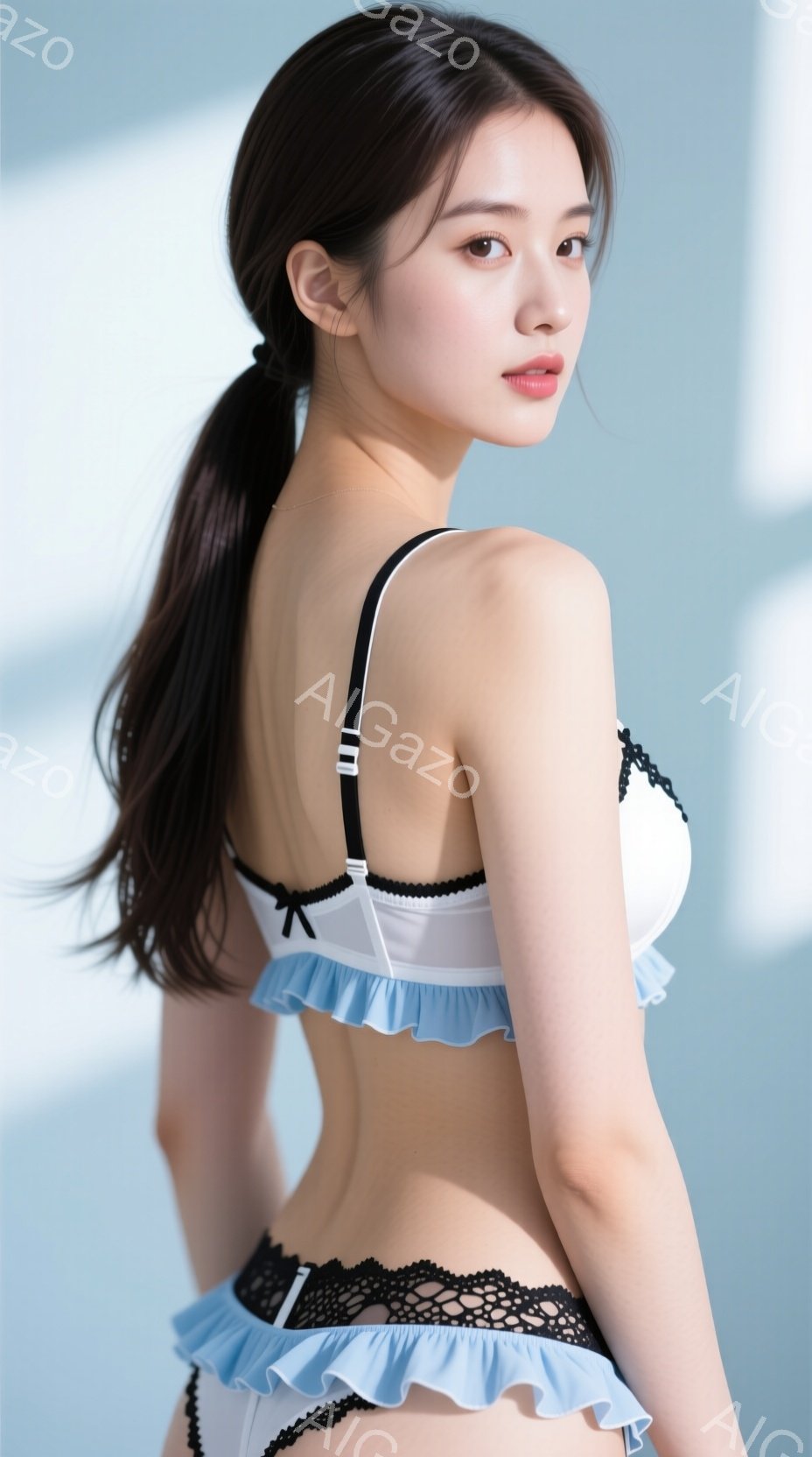 長い黒髪を背中で一本に結んだ女性が、白いブラと水色のフリルが付いたショーツを身に着けています。彼女はカメラに向かって少し振り返り、穏やかな微笑みを浮かべています。背景は淡い水色で、人物に焦点が当てられています。