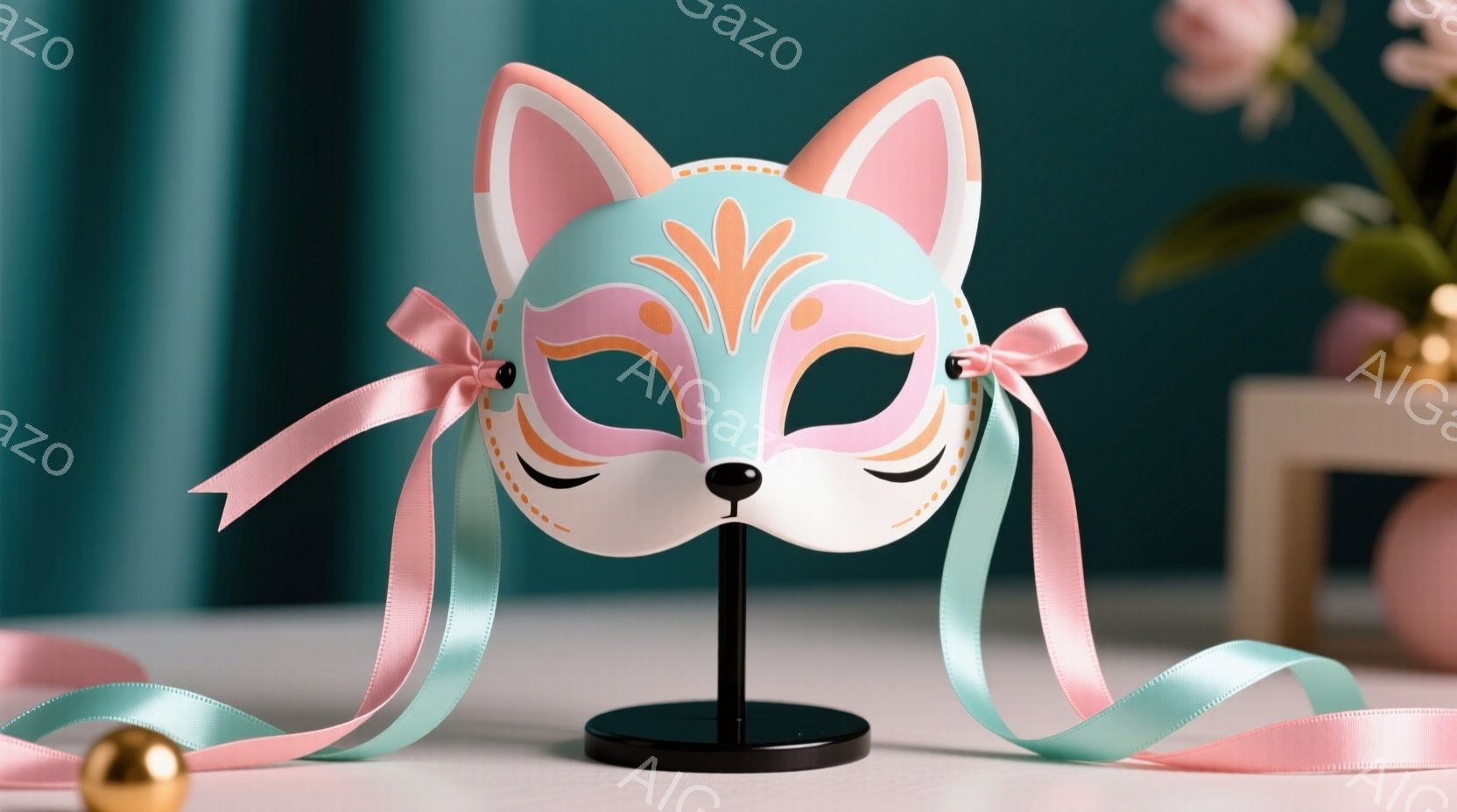 薄いピンク色の猫の仮面が、金色のスタンドに飾られています。仮面は左右に水色のリボンが付いており、可愛らしい印象を与えます。背景にはぼやけた家具が見え、全体的に柔らかく優しい雰囲気です。