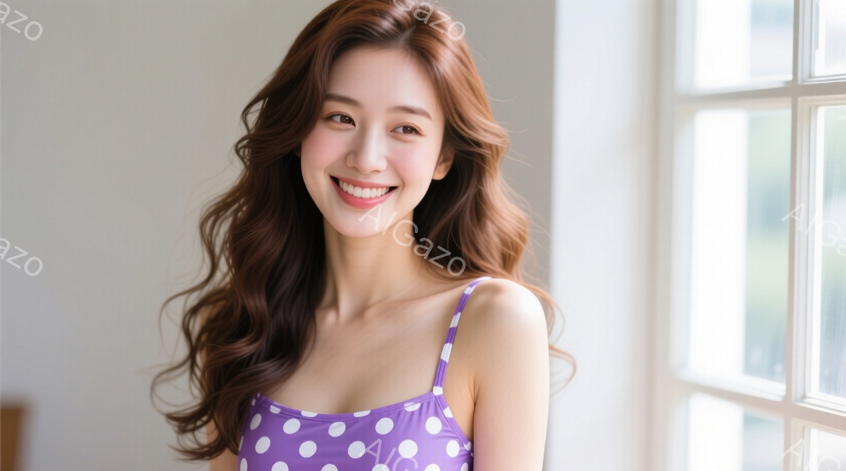 「明るい紫色の水玉模様のビキニトップを着た若い女性が写っています。彼女は微笑んでおり、長い茶色の髪は肩にかかっています。背景にはぼやけた室内と窓があり、光が差し込」は、2025年11月26日に作成されたAI生成画像です。 カジュアルをテーマとした高品質なビジュアル素材で、 1664×928px の解像度で提供しています。 個人利用・商用利用ともに無料でダウンロード可能で、クレジット表記も不要です。