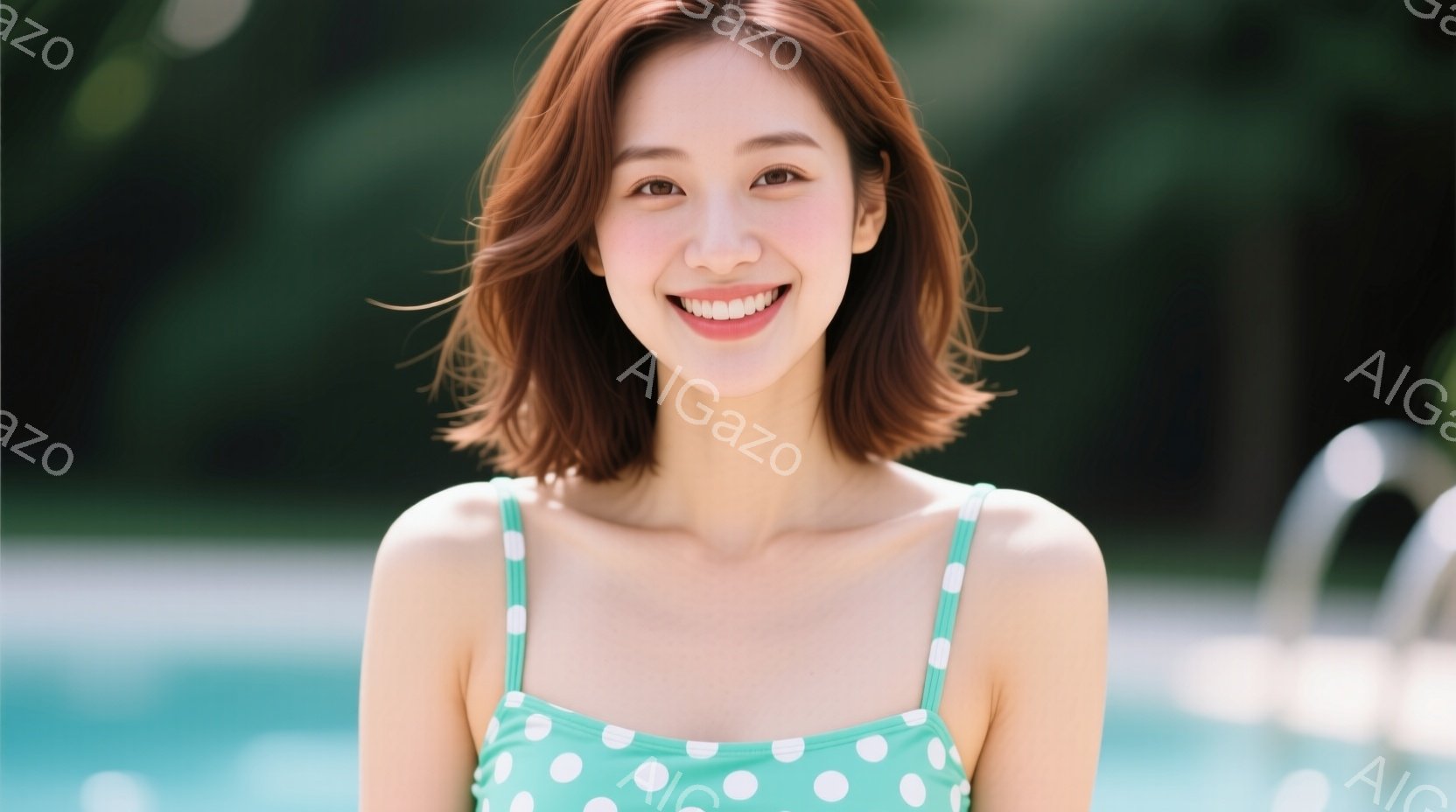明るい笑顔の女性が写っています。彼女は水玉模様のキャミソールを着ており、茶色のショートヘアです。背景にはプールと緑豊かな植物が見え、晴れた日のリラックスした雰囲気が漂っています。