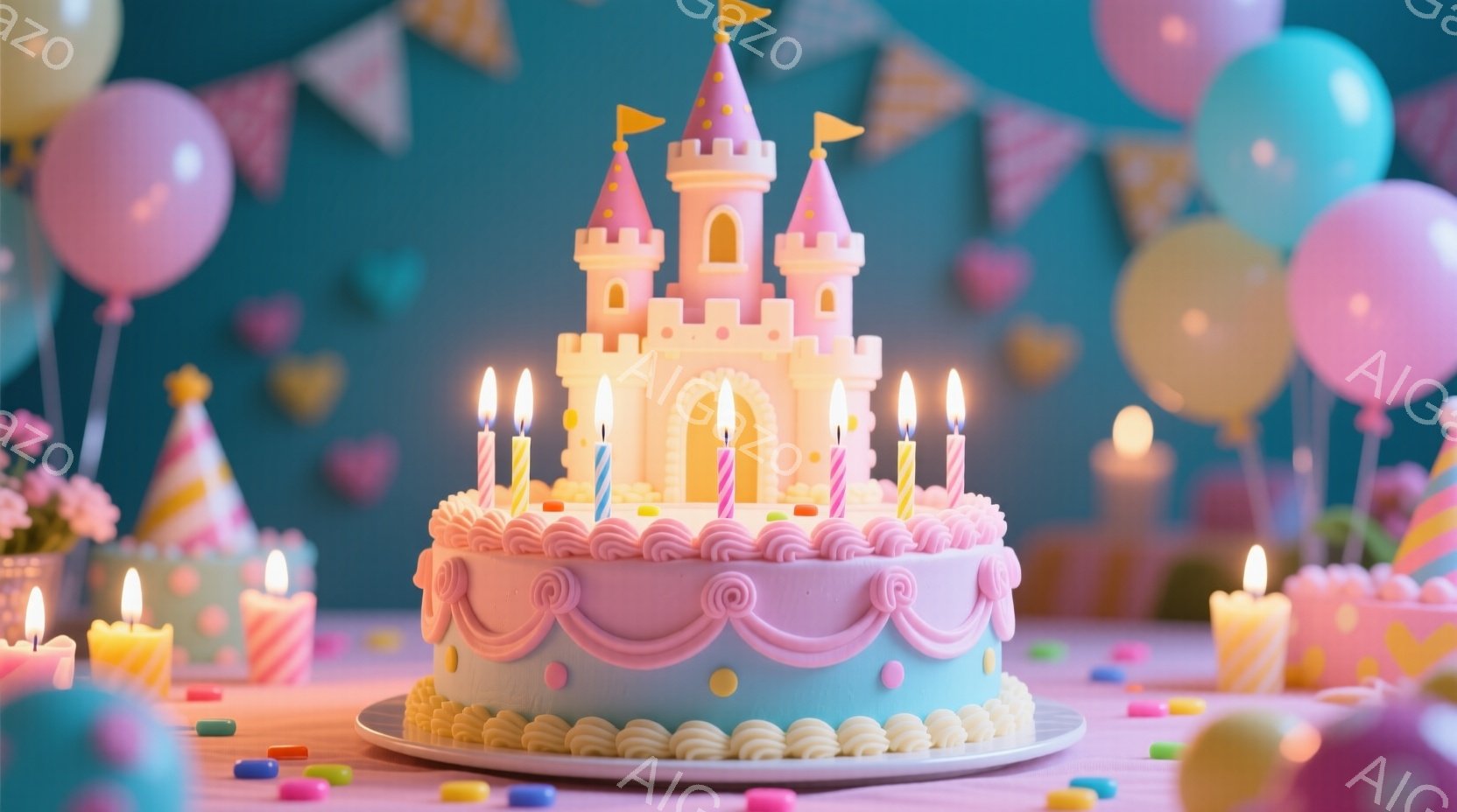 装飾されたバースデーケーキを中心に捉えられています。ケーキはピンクと水色のアイシングで覆われ、お城のようにデザインされています。背景には、パステルカラーの風船や点在するキャンドルがあり、お祝いの雰囲気を醸し出しています。