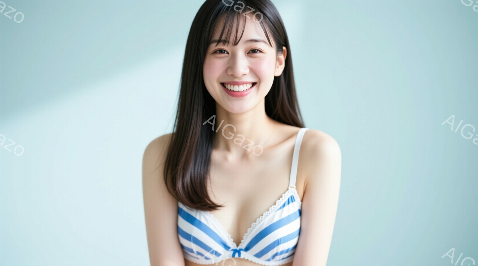 ストライプのブラレットを着た若い女性が正面を向いて微笑んでいます。彼女は長い黒髪で、少し頬を赤らめて明るい表情をしています。背景は白っぽい壁で、全体的に清潔感があり、明るく爽やかな雰囲気です。