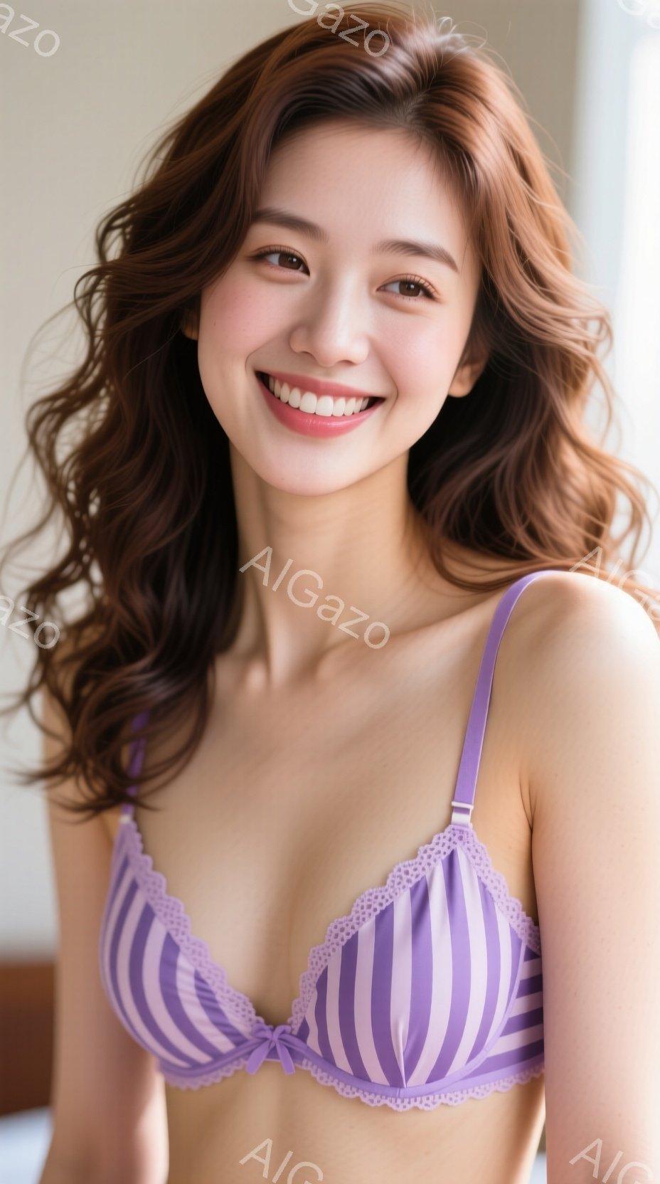 「若い女性がストライプ柄のピンク、水色、白のランジェリーセットを身に着けて立っています。彼女は微笑んでおり、短い茶色の髪をしています。背景には白いベッドと木製の家」は、2025年11月26日に作成されたAI生成画像です。 ストライプをテーマとした高品質なビジュアル素材で、 928×1664px の解像度で提供しています。 個人利用・商用利用ともに無料でダウンロード可能で、クレジット表記も不要です。