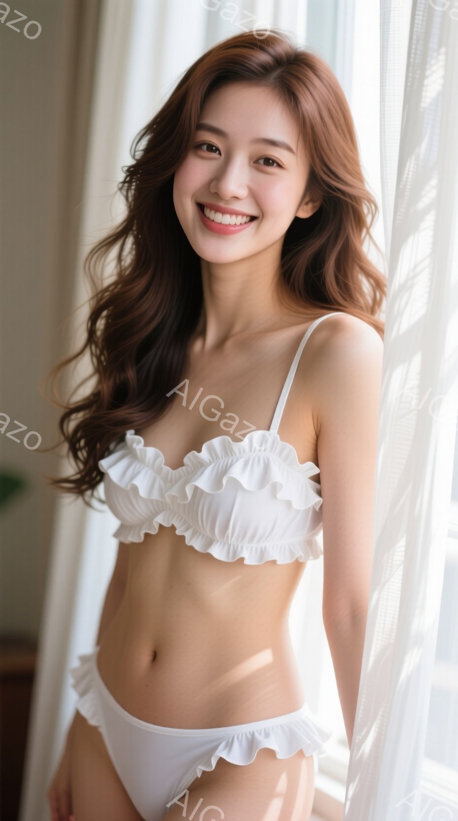 長い茶色の髪が肩にかかっている女性が、白いフリル付きのビキニを着て立っています。彼女は微笑んでいて、姿勢はリラックスしています。背景はぼやけており、窓からの自然光が差し込んでいます。