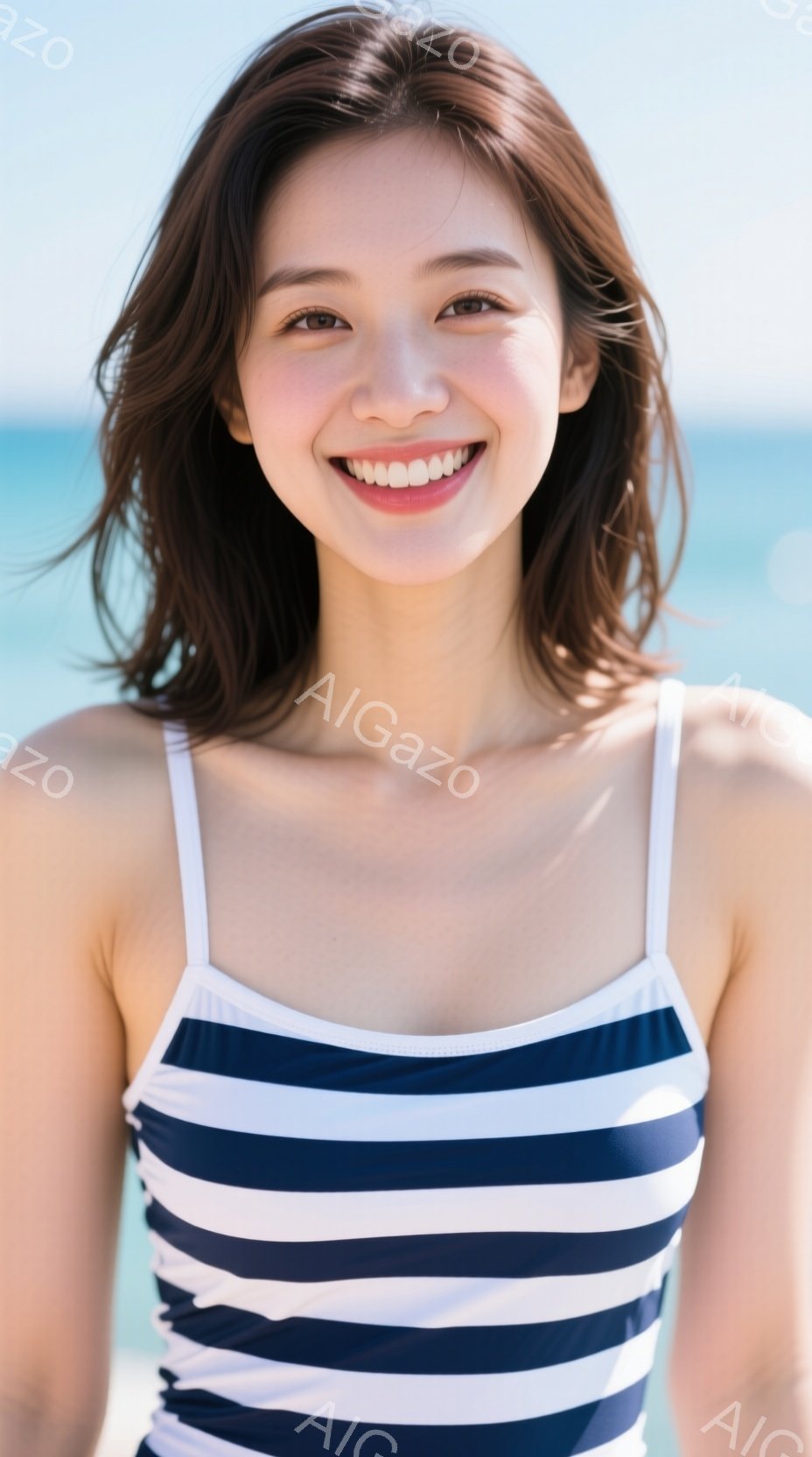 この女性は、紺色と白のストライプのワンピース水着を身に着けており、明るい笑顔を浮かべています。彼女は肩までの中髪で、少し横に流れています。背景は青い海と空で、晴れた日のビーチの穏やかな雰囲気です。