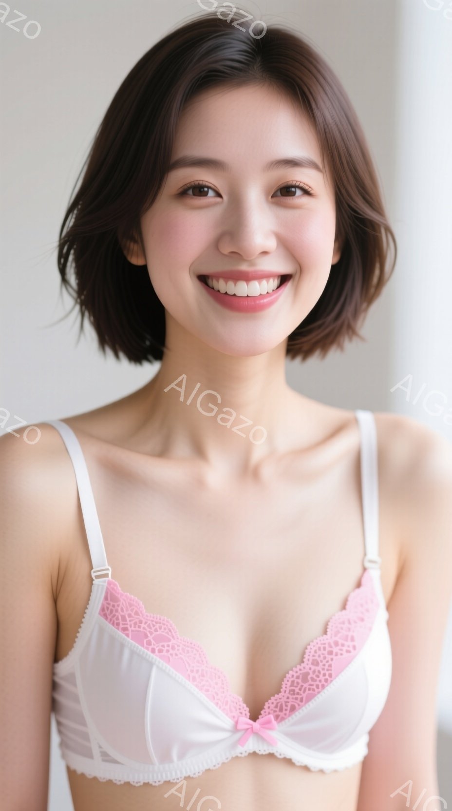 明るい茶色のショートヘアの女性が、ピンク色のレースのブラジャーを着用し、微笑んでいます。彼女は正面を向き、リラックスした姿勢で立っており、背景はぼやけていますが、おそらく室内の壁です。 全体的に、明るく、若々しく、自然な雰囲気です。