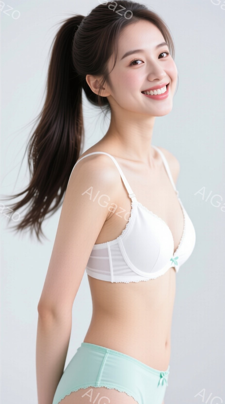 若い女性がターコイズブルーのブラジャーと白いレースのトリムを身に着けています。彼女は髪を高くポニーテールにしており、微笑んでカメラを見つめています。背景は淡い水色の単色で、全体的に清潔感があり、リラックスした雰囲気を醸し出しています。