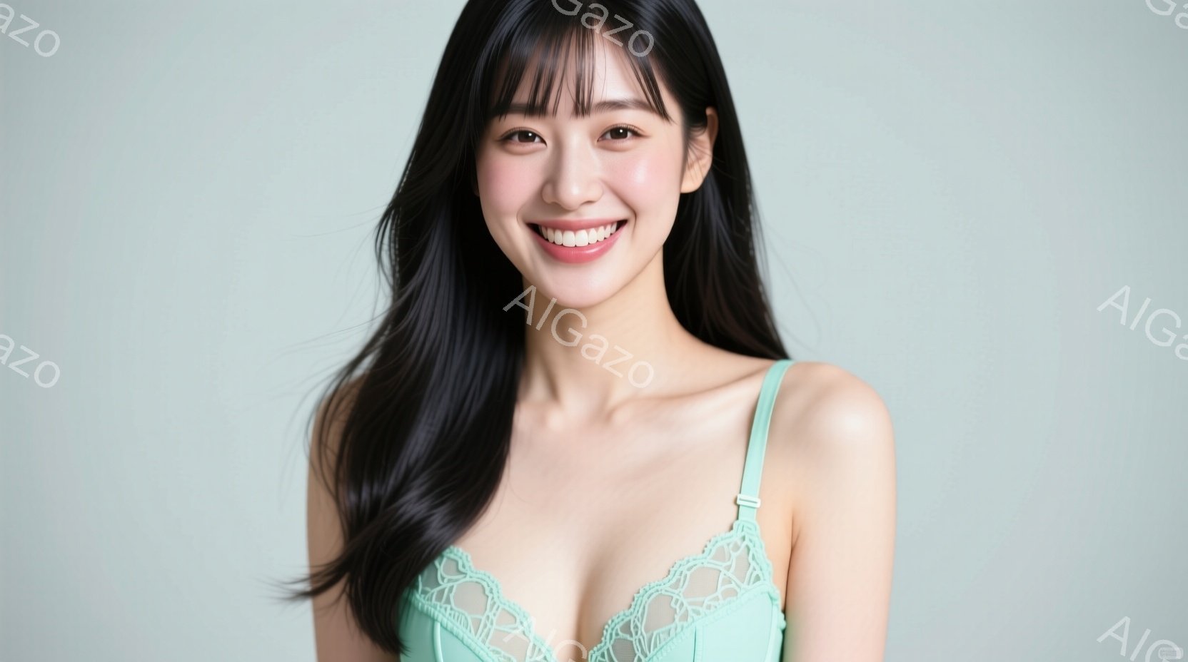 長い黒髪で、前髪は眉毛のあたりでカットされた若い女性が写っています。淡い緑色のレースのブラレットを着用し、笑顔でカメラを見ており、明るく優しい雰囲気を醸し出しています。背景は淡い色で統一されており、人物が際立っています。