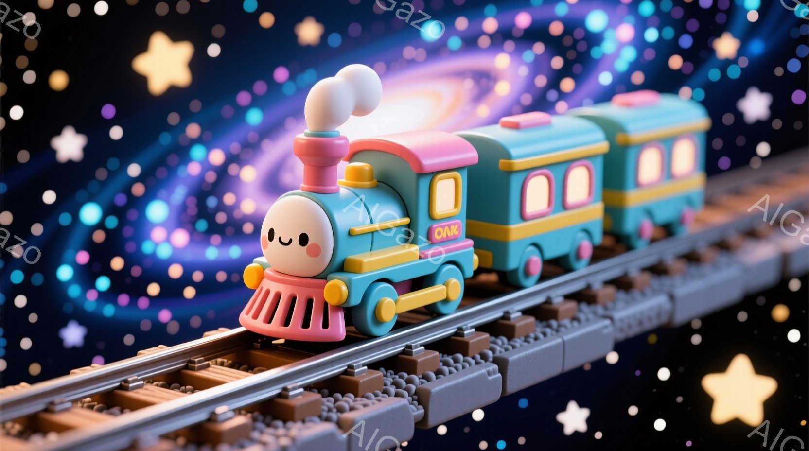明るい色の玩具列車が、星が散りばめられた暗い宇宙空間を走っている。列車の先頭車両はピンクと水色で、笑顔の顔が描かれている。背景には様々な色の惑星や星雲が浮かび、夢のような雰囲気を醸し出している。