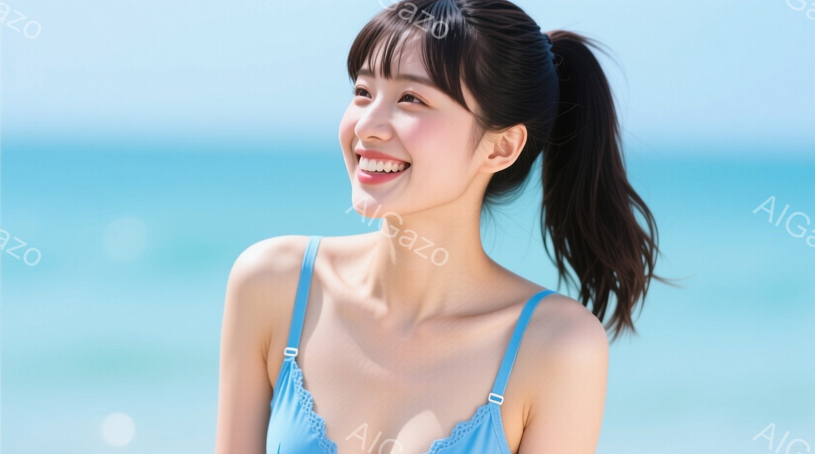 明るい青色のビキニトップスを着た若い女性が写っています。彼女は微笑んでおり、長い黒髪は後ろでポニーテールに結ばれています。背景はキラキラと輝く青い海で、晴れた日のビーチの爽やかな雰囲気を醸し出しています。