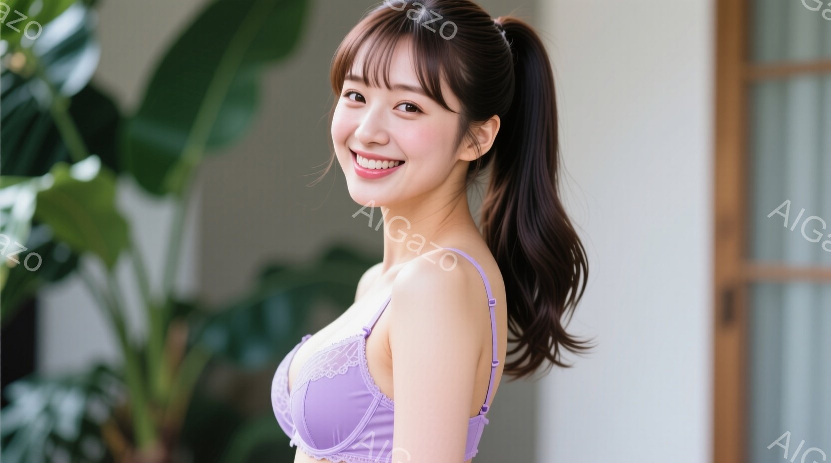 「画像には、明るい笑顔を見せる若い女性が写っています。彼女はライラック色のレースのブラレットを着ており、ダークブラウンの髪は高いポニーテールに結ばれています。背景」は、2025年11月27日に作成されたAI生成画像です。 クリーミーをテーマとした高品質なビジュアル素材で、 1664×928px の解像度で提供しています。 個人利用・商用利用ともに無料でダウンロード可能で、クレジット表記も不要です。