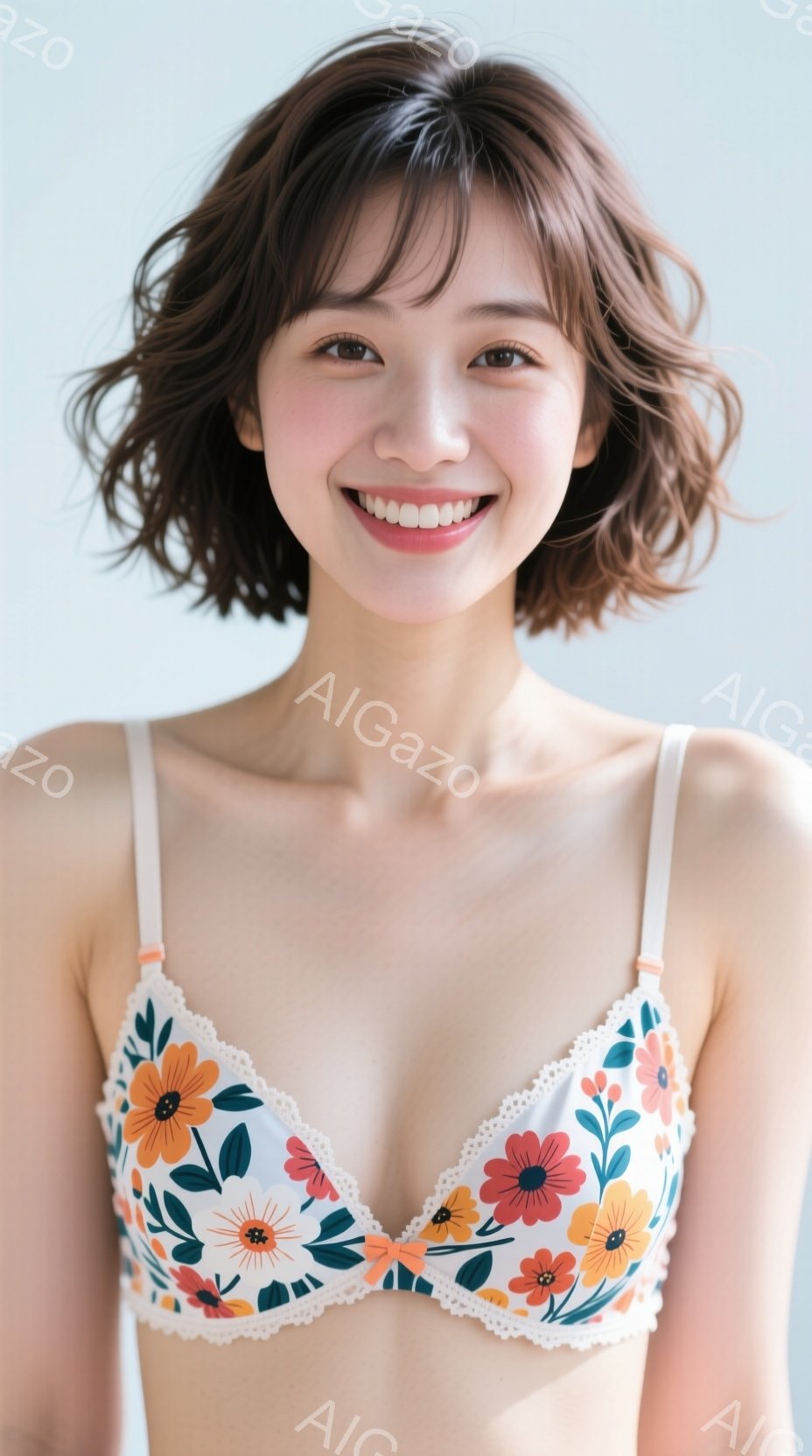 明るい背景を背に、花柄のブラレットを身につけた若い女性が写っています。彼女は肩を出し、微笑みを浮かべており、髪は肩までの長さのゆるいウェーブがかかっています。全体的に明るく、親しみやすい雰囲気のポートレートです。