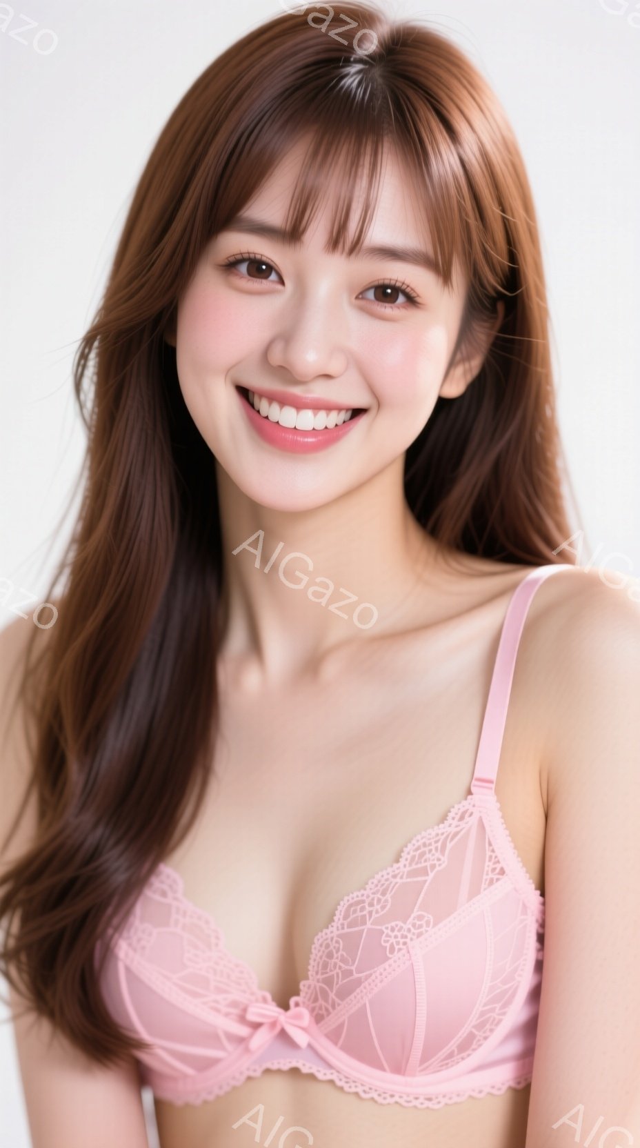 黒髪の女性が、淡い紫色のレースのブラジャーを着用し、カメラに向かって微笑んでいます。彼女は肩を出し、リラックスした姿勢で、少し下を見つめています。背景は明るい窓で、白っぽい室内であることがわかります。
