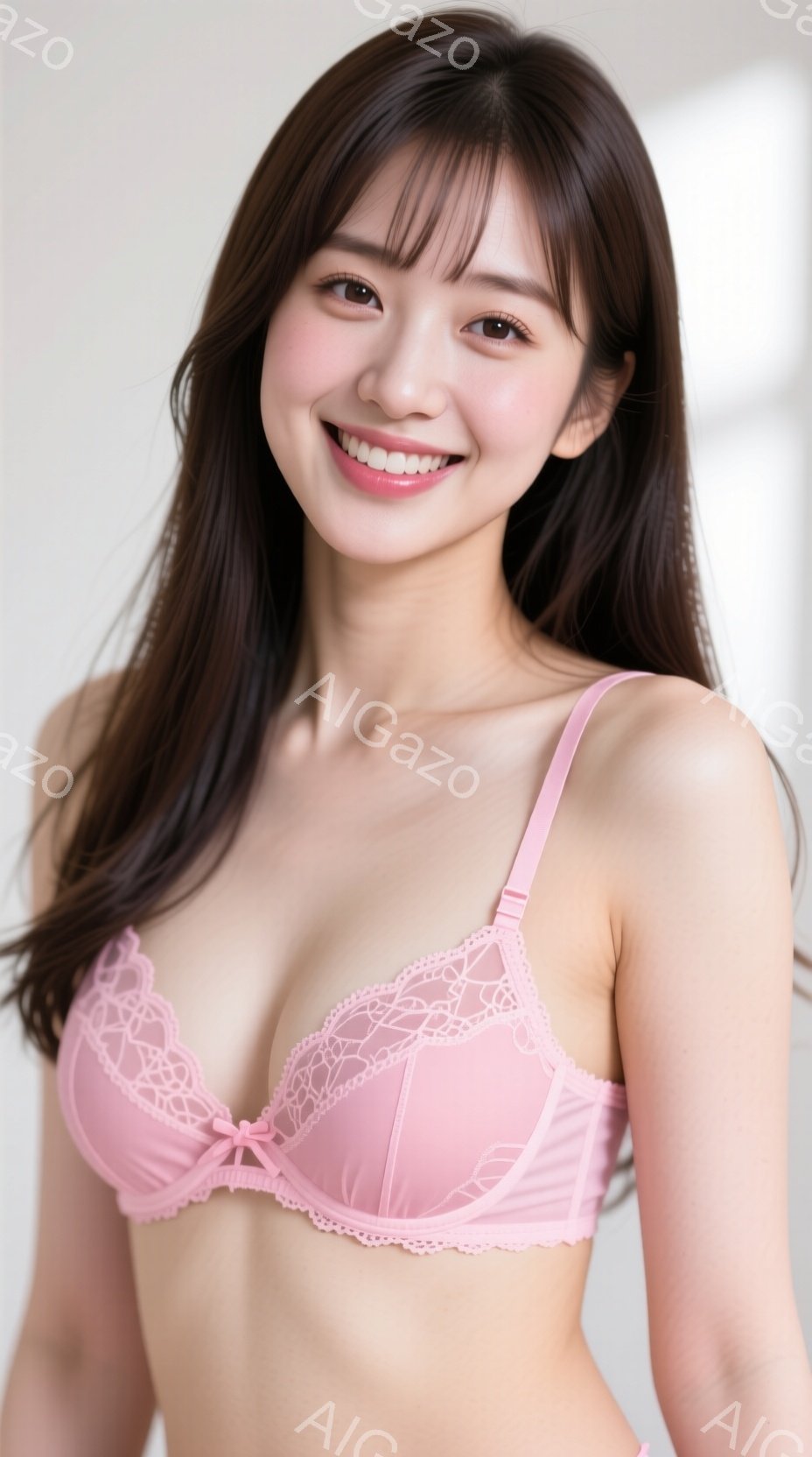 「長い黒髪をセンターパートにした女性が、淡い水色のランジェリーセットを身につけて微笑んでいます。彼女はベッドの前に立ち、やや内向きに姿勢を正し、リラックスした表情」は、2025年11月27日に作成されたAI生成画像です。 インナーウェアをテーマとした高品質なビジュアル素材で、 928×1664px の解像度で提供しています。 個人利用・商用利用ともに無料でダウンロード可能で、クレジット表記も不要です。