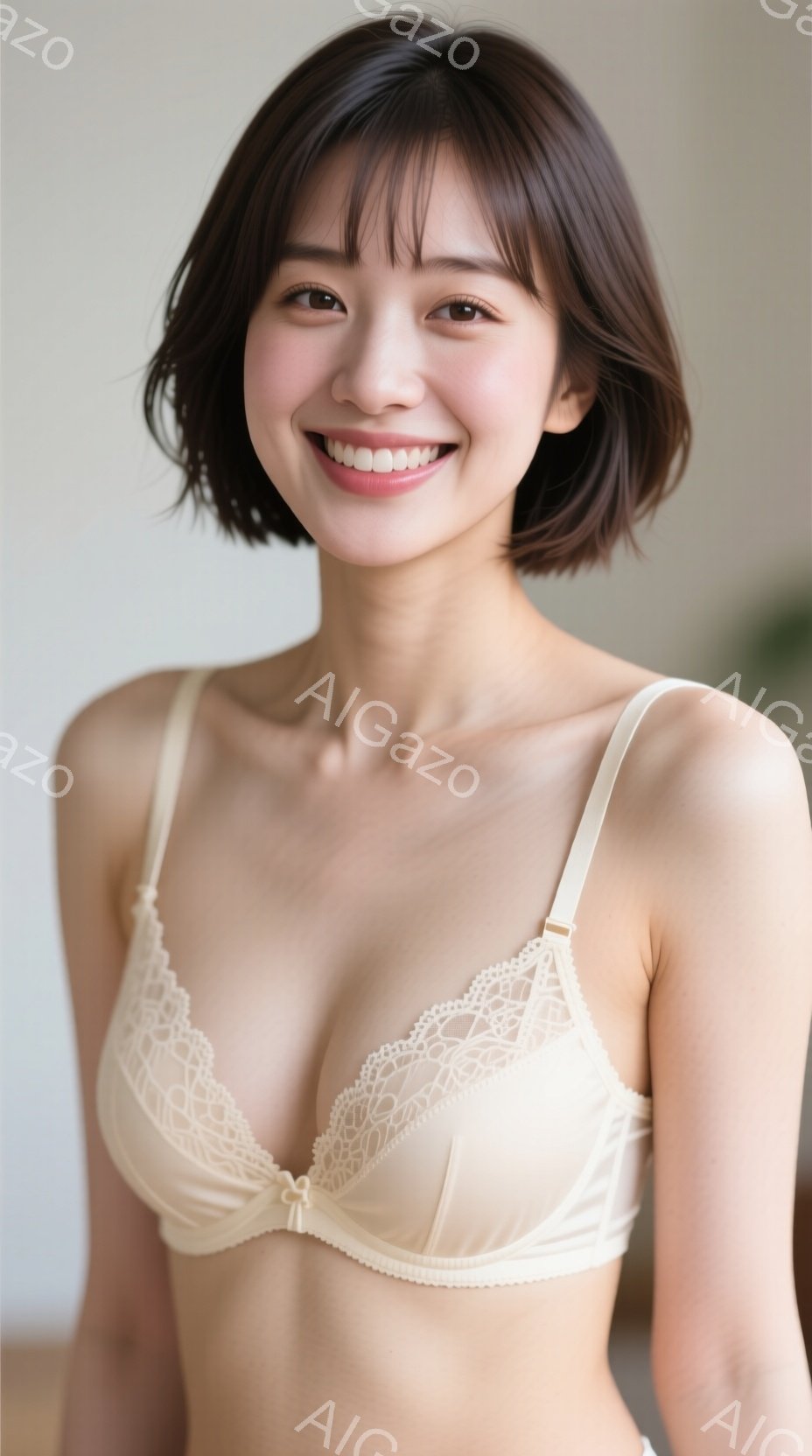 「画像は、明るいクリーム色のレース付きブラレットを着た若い女性を捉えています。彼女は肩までの長さの茶色の髪を持ち、微笑んでおり、リラックスした表情です。背景はぼや」は、2025年11月27日に作成されたAI生成画像です。 インドアをテーマとした高品質なビジュアル素材で、 928×1664px の解像度で提供しています。 個人利用・商用利用ともに無料でダウンロード可能で、クレジット表記も不要です。