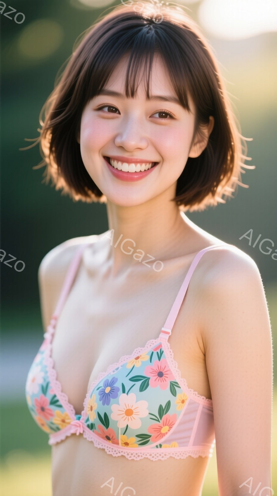 明るい屋外で、花柄のピンク色のブラレットを着た若い女性が写っています。彼女は短い茶色の髪で、微笑んでおり、リラックスした姿勢でカメラに向かって少し体を傾けています。背景は緑豊かな自然で、太陽の光が柔らかく差し込み、全体的に穏やかで自然な雰囲気です。