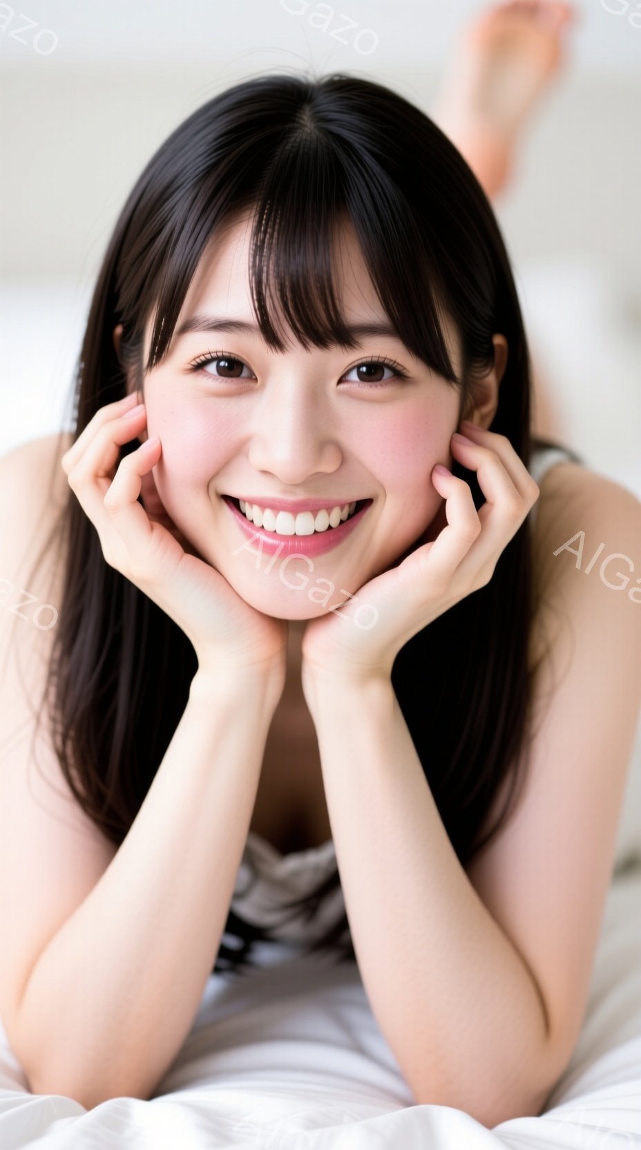 「長い黒髪で前髪はぱっつんカットの女性が、白いベッドの上で両頬に手を当てて笑顔でこちらを見ている。明るい色のトップスを着ており、背景にはぼやけた家具が見える。全体」は、2025年11月27日に作成されたAI生成画像です。 インドアをテーマとした高品質なビジュアル素材で、 928×1664px の解像度で提供しています。 個人利用・商用利用ともに無料でダウンロード可能で、クレジット表記も不要です。