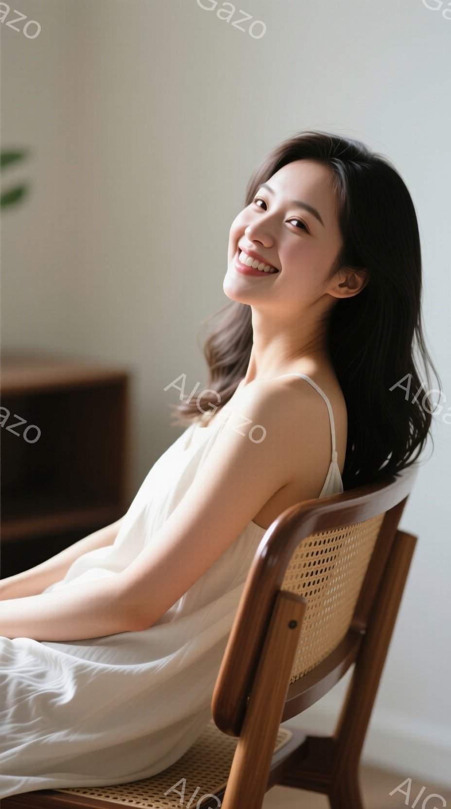 「長い黒髪を無造作に肩にかけた女性が、白いキャミソールワンピースを着て窓辺に立っている。彼女は微笑んでおり、柔らかい光が彼女の顔を照らし、穏やかな雰囲気を醸し出し」は、2025年11月27日に作成されたAI生成画像です。 キャミソールをテーマとした高品質なビジュアル素材で、 928×1664px の解像度で提供しています。 個人利用・商用利用ともに無料でダウンロード可能で、クレジット表記も不要です。