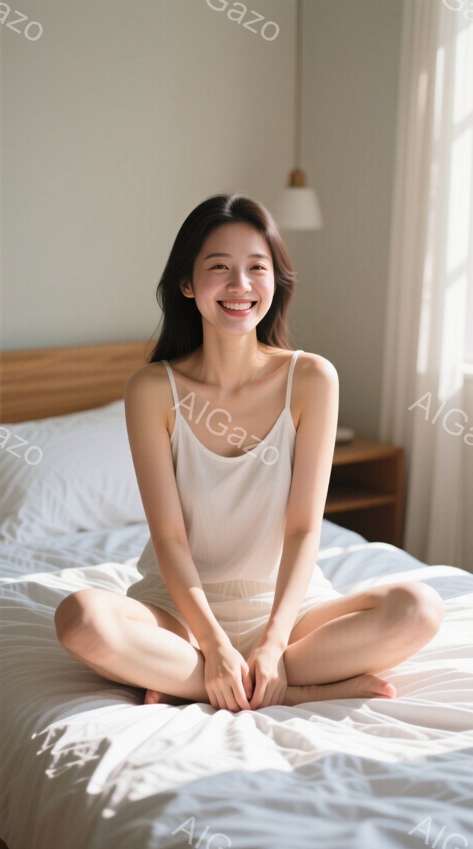 明るい日差しが差し込むベッドの上に、女性が足を組んで座っています。白いタンクトップとグレーのショートパンツを身に着け、リラックスした表情で微笑んでいます。背景には木製のナイトスタンドがあり、穏やかで安らぎのある雰囲気が漂っています。