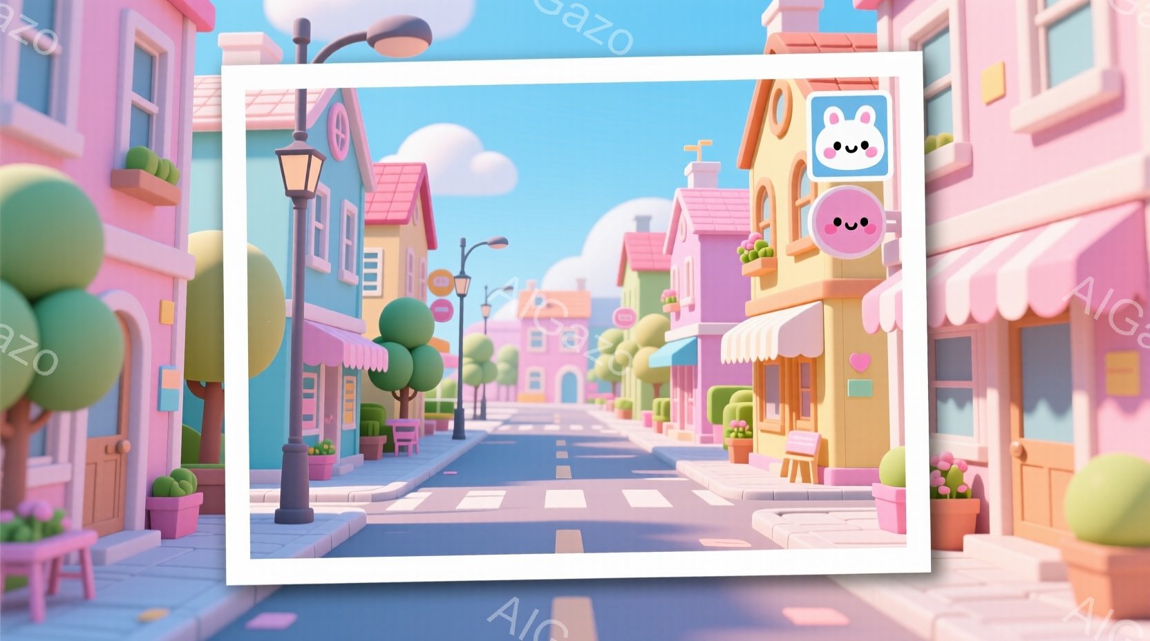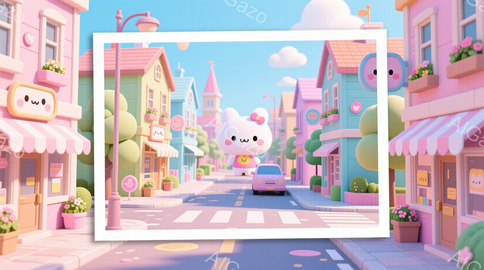 鮮やかなピンクと水色の建物が立ち並ぶ、可愛らしい街並みです。道路には白線が引かれ、歩道には鉢植えの植物が置かれています。背景には雲が浮かび、全体的に柔らかく夢のような雰囲気です。