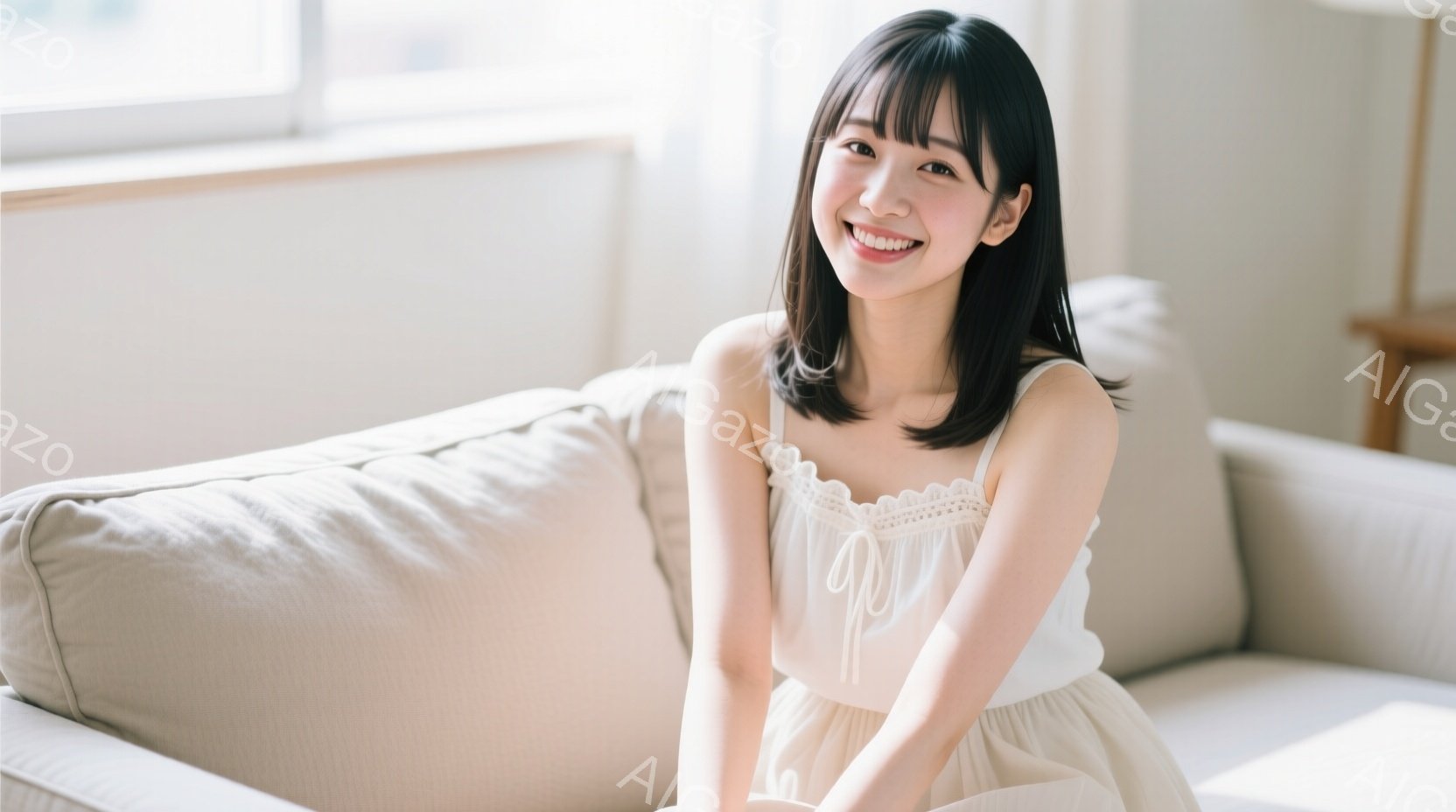 明るい室内で、若い女性がベージュ色のソファに座って微笑んでいます。彼女は肩出しの白いワンピースを着ており、前髪のある黒髪が印象的です。背景はシンプルで、柔らかい光が差し込み、リラックスした穏やかな雰囲気を醸し出しています。
